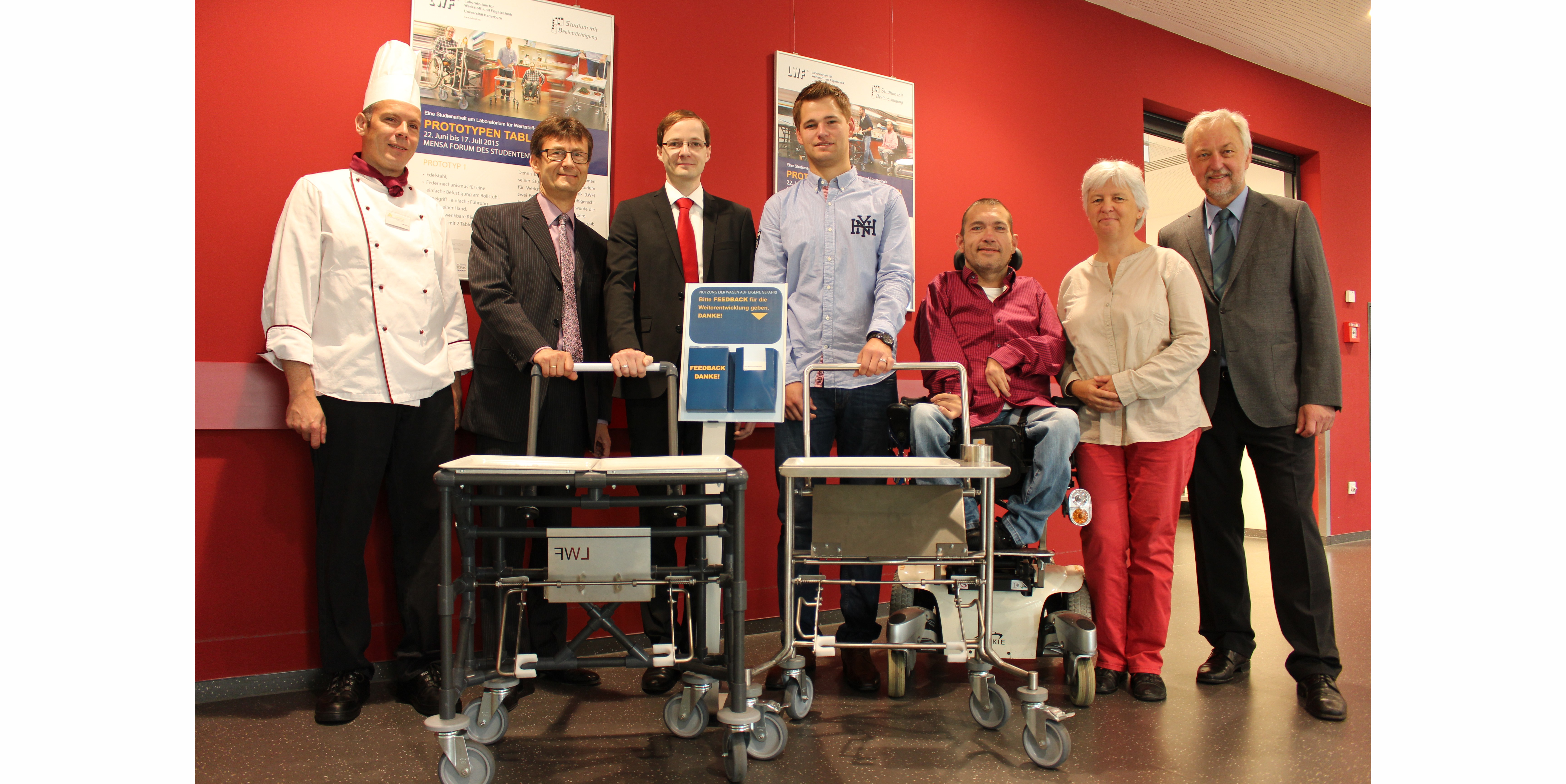 Bei der Konstruktion der Prototypen orientierte sich Dennis Bertels eng an den Anregungen und Anforderungen von Lars Hemme, der bei der Zentralen Studienberatung Studierende mit Beeinträchtigung berät. Die beiden mit Eigenmitteln des LWF erstellten Tablettwagen werden jetzt einige Wochen in der Mensa Forum getestet. In dieser Zeit wollen die Konstrukteure durch Befragungen Feedback einholen und die Wagen eventuell weiterentwickeln.