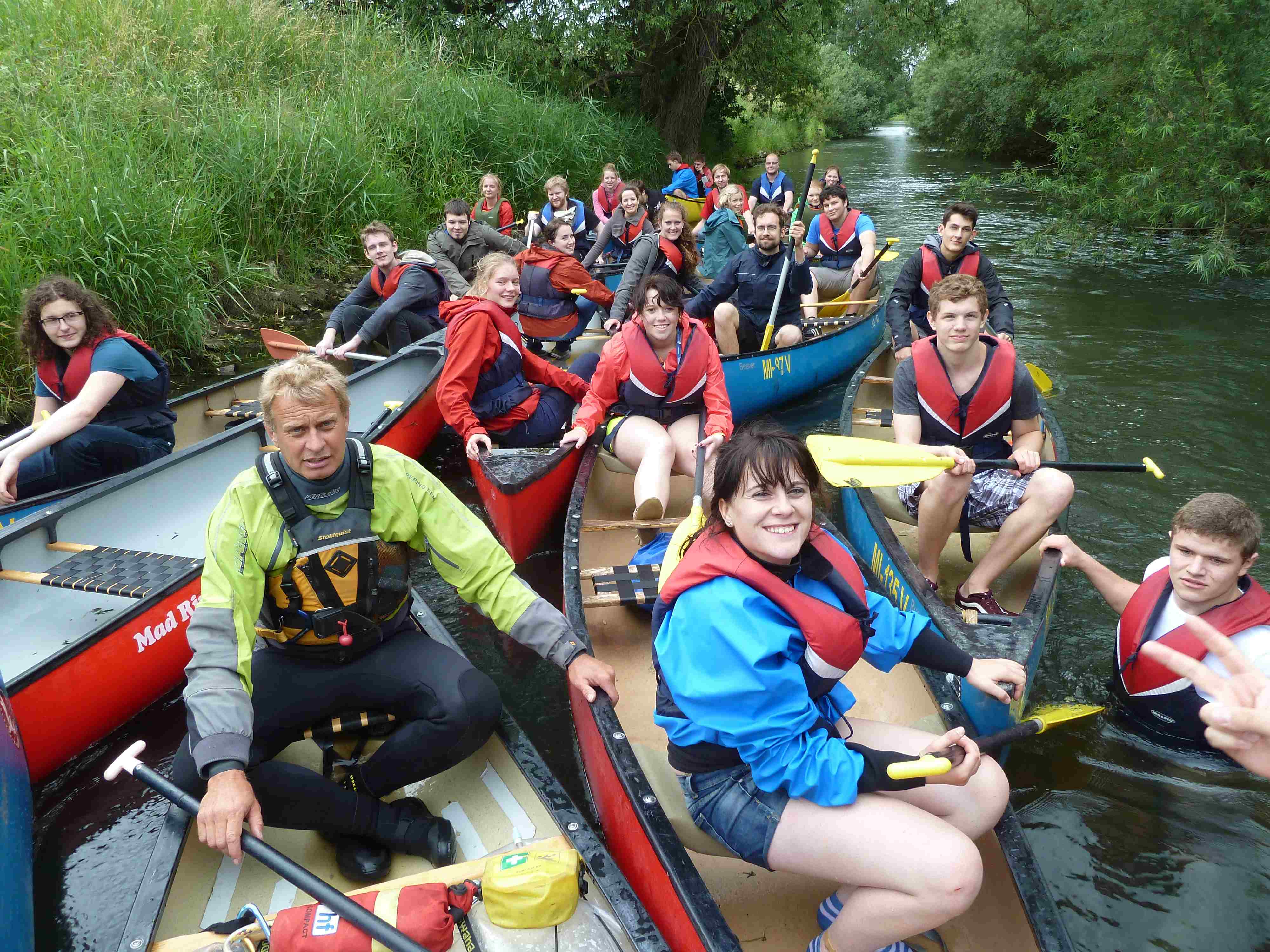 Unter dem Motto „Angewandte Physik“ fand als teambildende Maßnahme am dritten Tag eine Kanutour auf der Lippe statt. Natürlich nicht, ohne vorher von Theorie-Professor Arno Schindlmayr etwas über die Strömungsdynamik von Wasser zu erfahren. Mit komplizierten Formeln erklärte er, was Wasser an Engstellen macht und warum schon kleinere Engstellen im Blutkreislauf ein dramatisches, gesundheitliches Problem darstellen.
