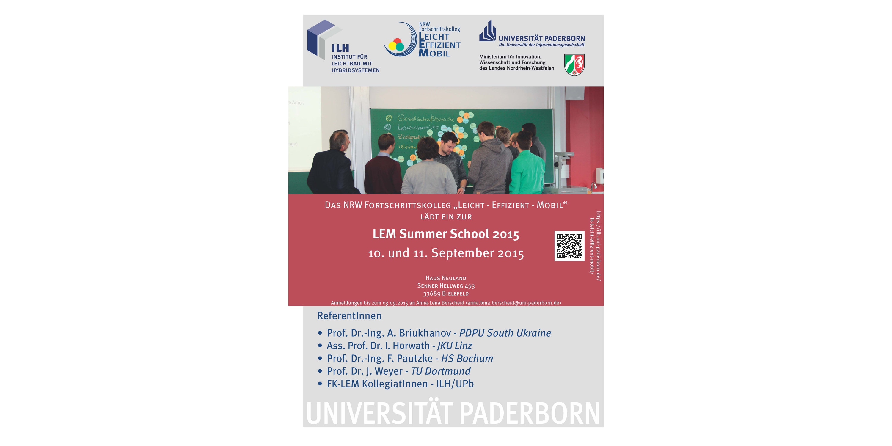 Am 10. und 11. September findet in Bielefeld die erste Summer School des NRW Fortschrittskollegs „Leicht – Effizient – Mobil“ statt. Das im August 2014 initiierte Kolleg agiert unter der Überschrift „Energie- und kosteneffizienter Extremleichtbau mit Hybridwerkstoffen“ und ist im Institut für Leichtbau mit Hybridsystemen (ILH) der Universität Paderborn angesiedelt. Das Fortschrittskolleg verbindet Natur- und Technikwissenschaften mit Gesellschaftswissenschaften auf eine neue Art und Weise. Unsere besondere Aufmerksamkeit richtet sich dabei auf Schnittstellen der verschiedenen Spezialgebiete und die Einbindung von Fragestellungen zu gesellschaftlichen Auswirkungen auf technologische Anwendungen und Entwicklungen. Elf geförderte und sechs assoziierte Doktorand_innen durchlaufen ein breit aufgestelltes Qualifizierungsprogramm, in dem zusätzliche fachliche und soziale Kompetenzen vermittelt werden. Als Teil dieser Qualifizierungsmaßnahmen wird jährlich eine Summer School durchgeführt.