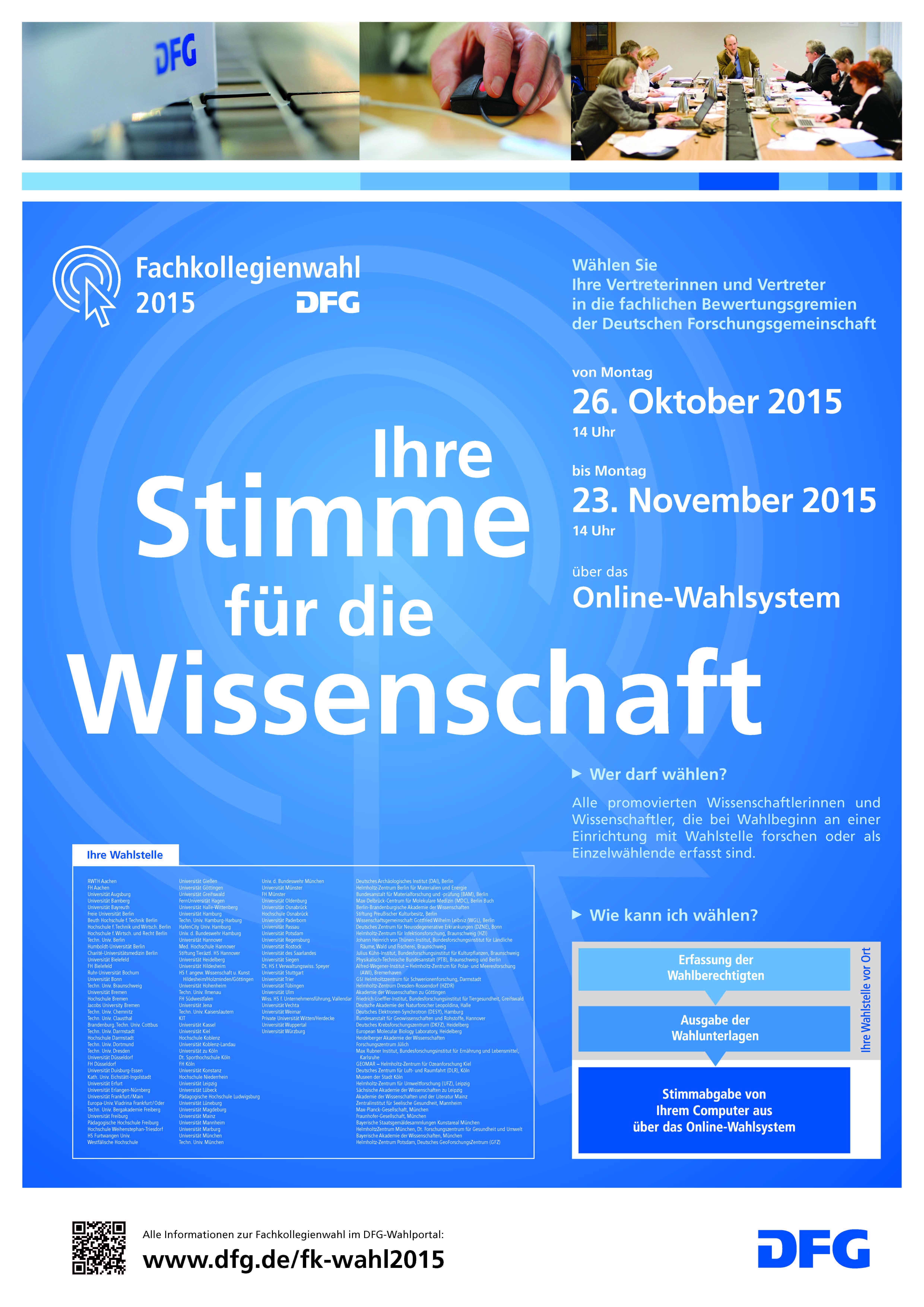 Vom 26.10.2015, 14 Uhr, bis 23.11.2015, 14 Uhr, findet turnusmäßig wieder die Wahl zu den Fachkollegien der Deutschen Forschungsgemeinschaft (DFG) durch die aktiv wahlberechtigten Wissenschaftlerinnen und Wissenschaftler statt. Sie ist ein entscheidender Bestandteil der Selbstverwaltung der Wissenschaft in Deutschland, weshalb die DFG bereits jetzt alle aktiv wahlberechtigten Wissenschaftlerinnen und Wissenschaftler um Teilnahme an der Wahl bittet.