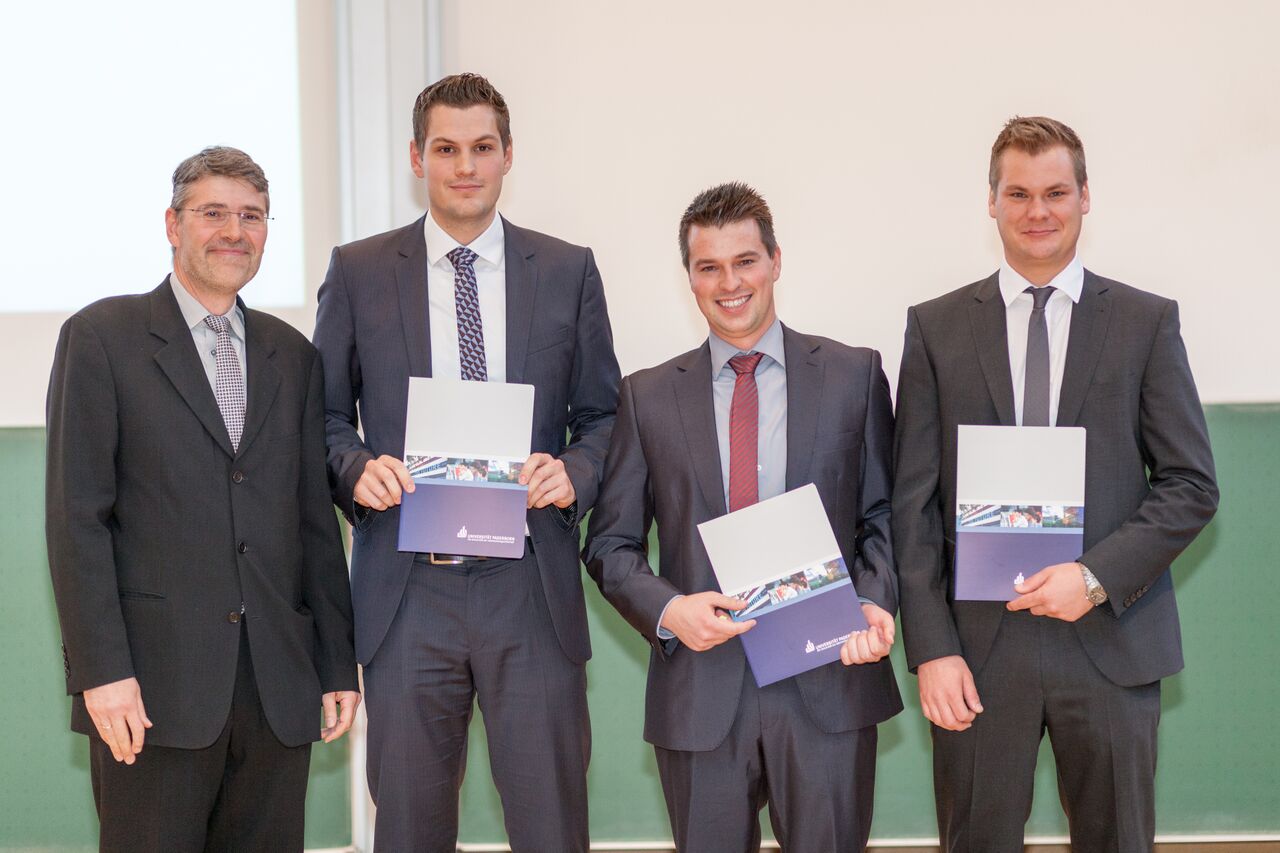 Stets mit Spannung erwartet werden die Auszeichnungen für hervorragende Studienabschlüsse mit den kürzesten Studienzeiten. Studiendekan Prof. Dr.-Ing. Hans-Joachim Schmid überreichte den Fakultätspreis an Eduard Penner und Robin Schütte (beide Maschinenbau) und an Julian Echterfeld (Wirtschaftsingenieurwesen). Die Prämierten freuten sich über eine Urkunde und jeweils 1.000 Euro Preisgeld.