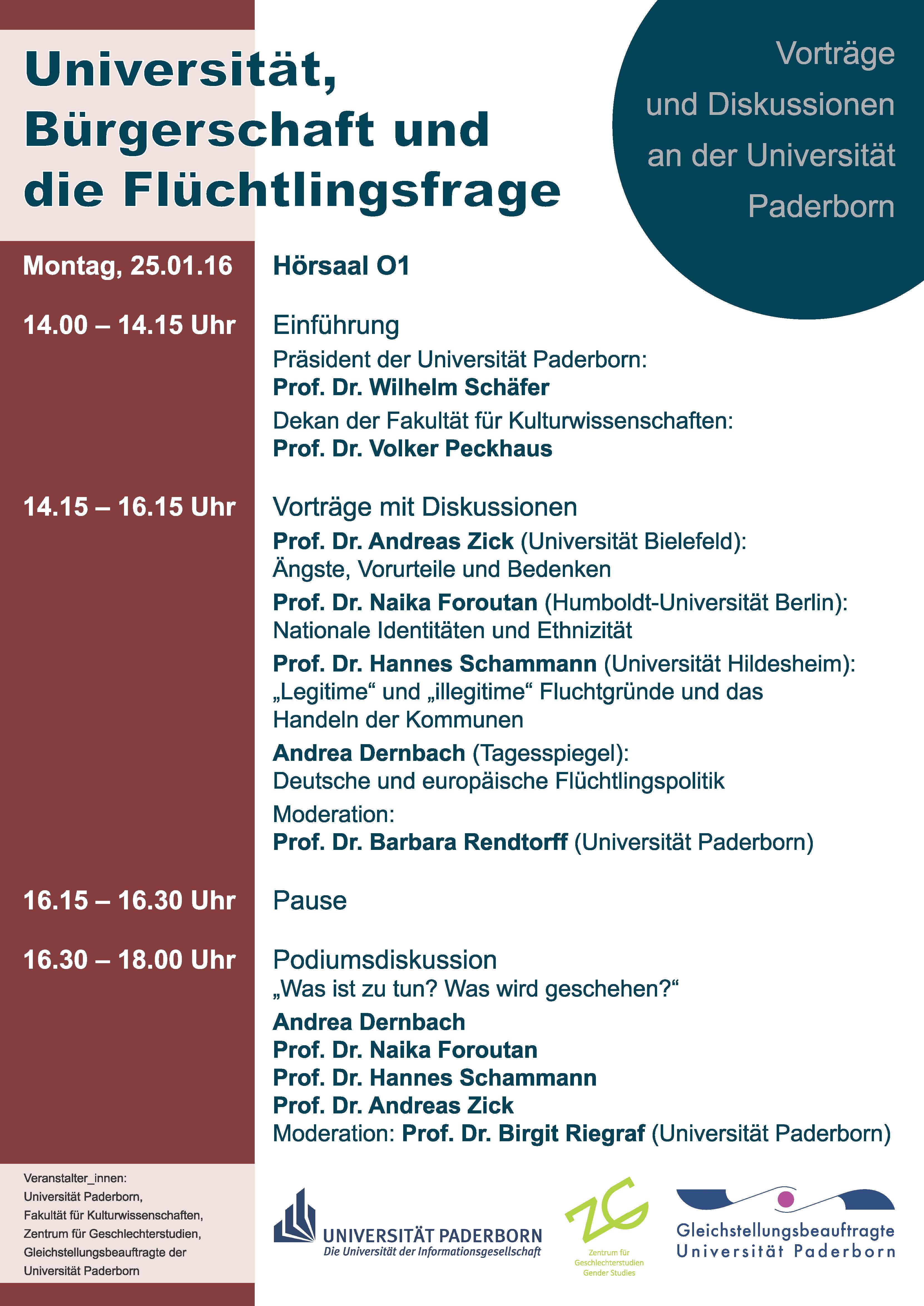 Aus aktuellem Anlass und initiiert durch die Fakultät für Kulturwissenschaften führt die Universität Paderborn eine universitätsöffentliche Veranstaltung mit namhaften Expert/innen durch, die sich mit dem Thema „Die Universität, die Bürgerschaft und die Flüchtlingsthematik“ befassen wird.