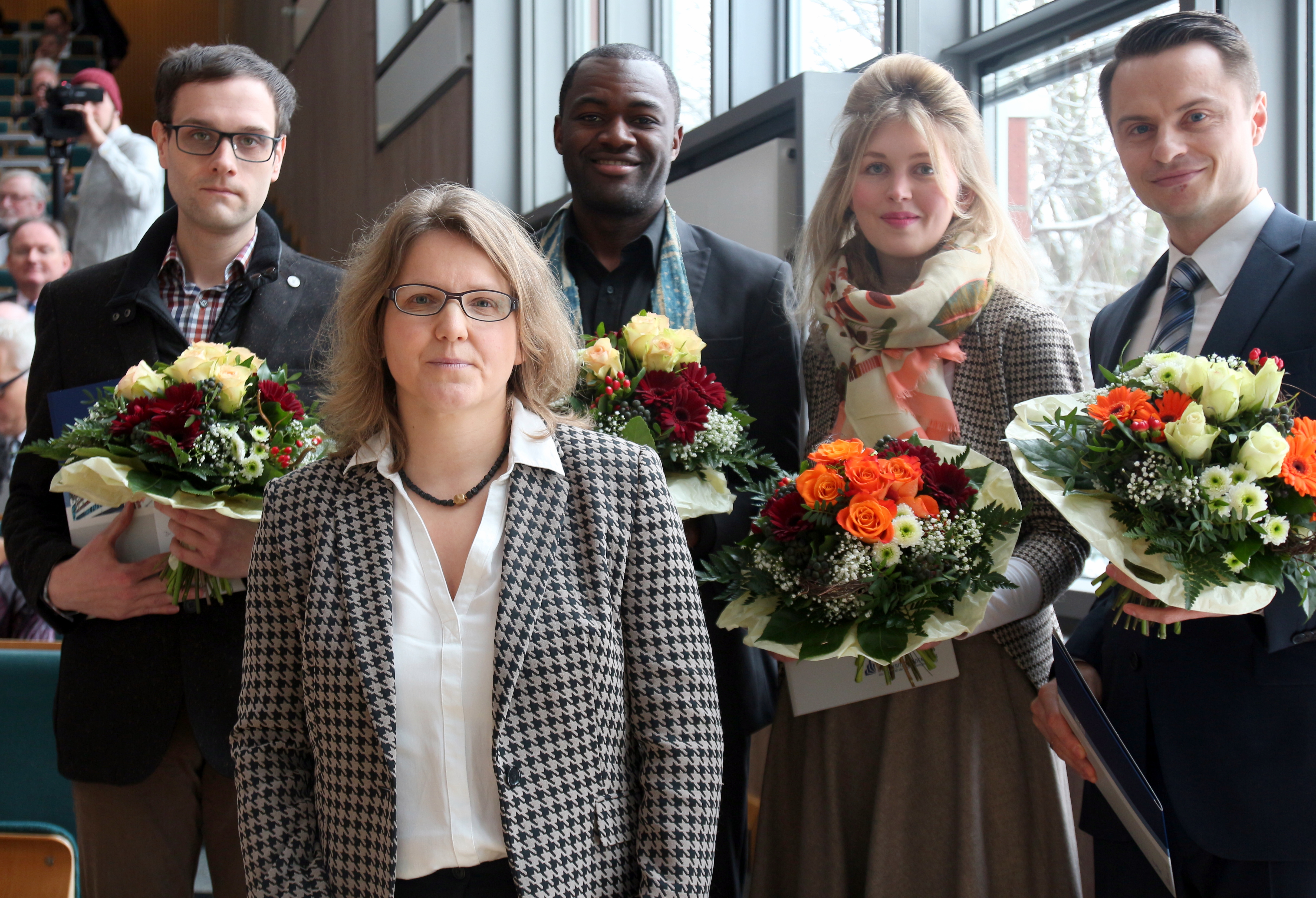 Preise für ausgezeichnete Dissertationen erhielten Dr. Yanick Kemayou, Dr.-Ing. Andre Riemer, Dr. Leonie Süwolto sowie Dr. Christan Wiebeler. Prof. Dr. Christine Silberhorn, Vizepräsidenten für Forschung und wissenschaftlichen Nachwuchs, überreichte die Urkunden.