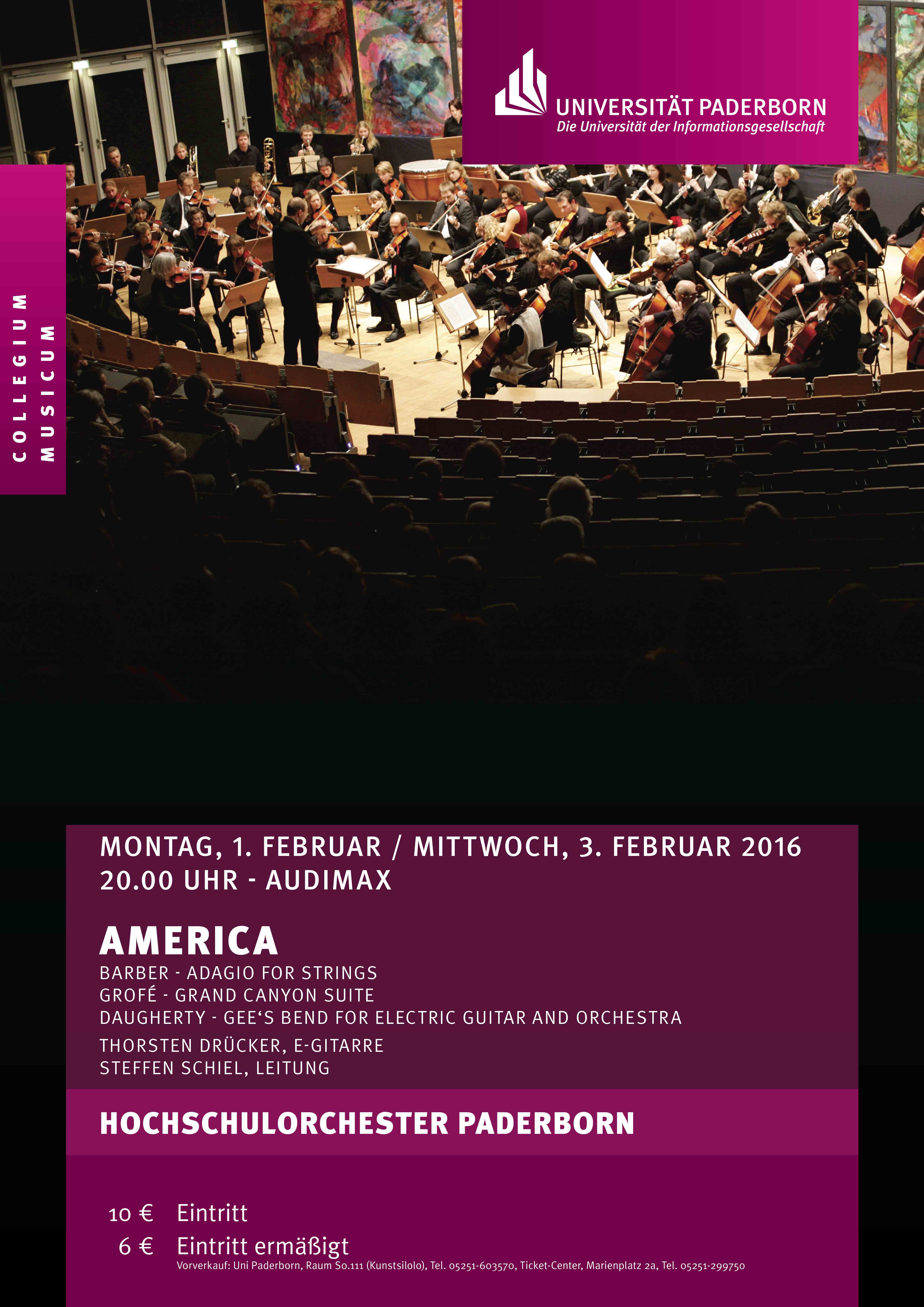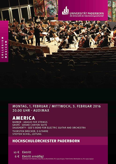Das Hochschulorchester Paderborn unter der Leitung seines Dirigenten Steffen Schiel präsentiert zum Abschluss des Wintersemesters Musik von drei amerikanischen Komponisten: Samuel Barber, Ferde Grofé und Michael Daugherty, dessen Konzert für E-Gitarre "Gee's Bend" zu hören sein wird. Solist der Konzerte ist der Gitarrist Thorsten Drücker, einer der vielseitigsten Musiker der aktuellen Gitarrenszene und Dozent an der Universität Paderborn. Die Konzerte am Montag, 1., und Mittwoch, 3. Februar, finden im Audimax der Universität statt. Beginn ist jeweils um 20.00 Uhr.
