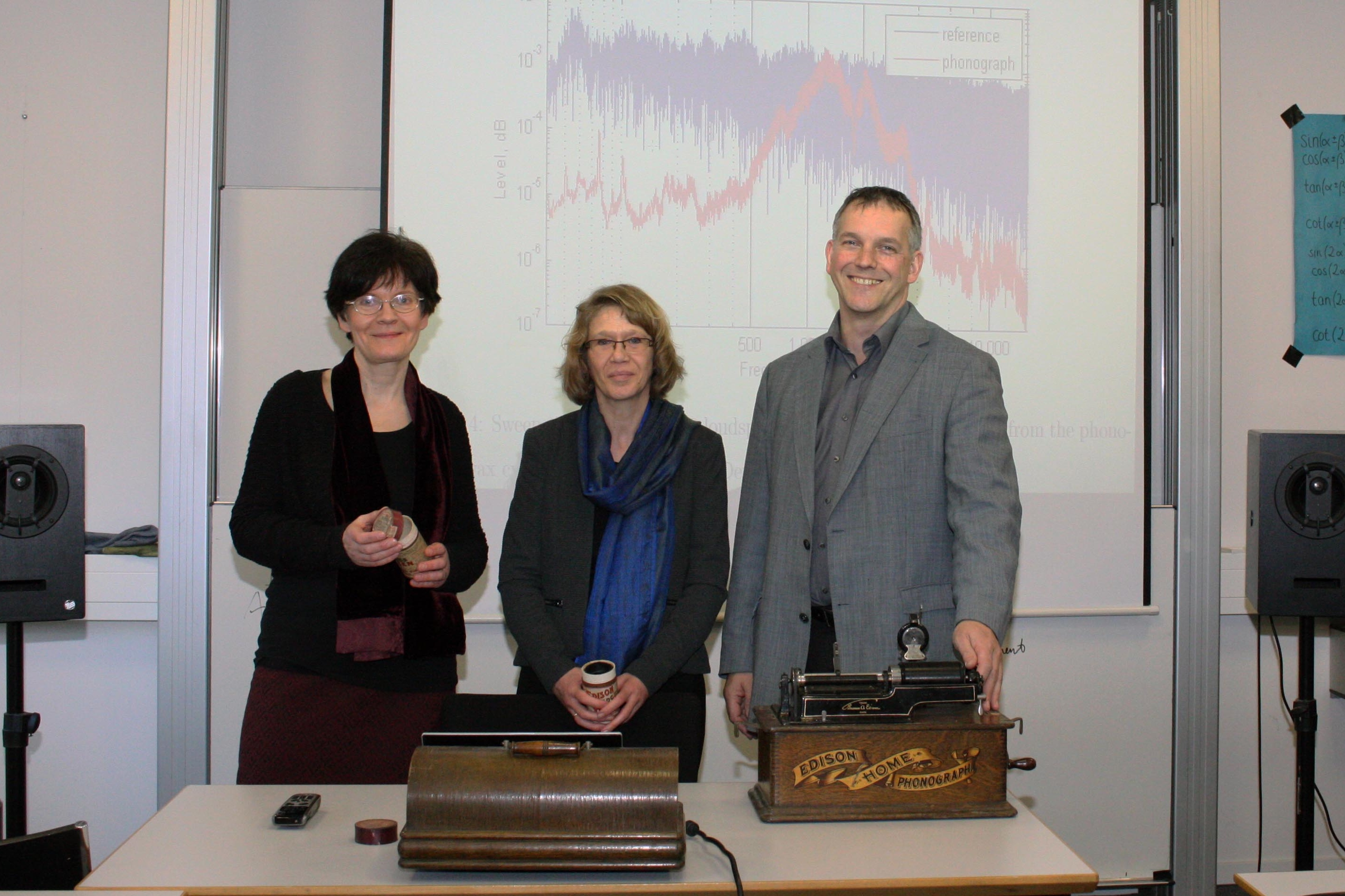 Foto: Auf der Suche nach dem historischen Klang der Stimme: Prof. Dr. Rebecca Grotjahn, Dr. Karin Martensen und Prof. Dr.-Ing. Malte Kob vor einer akustischen Klanganalyse eines Edison-Phonographen. © HfM Detmold/Plettenberg