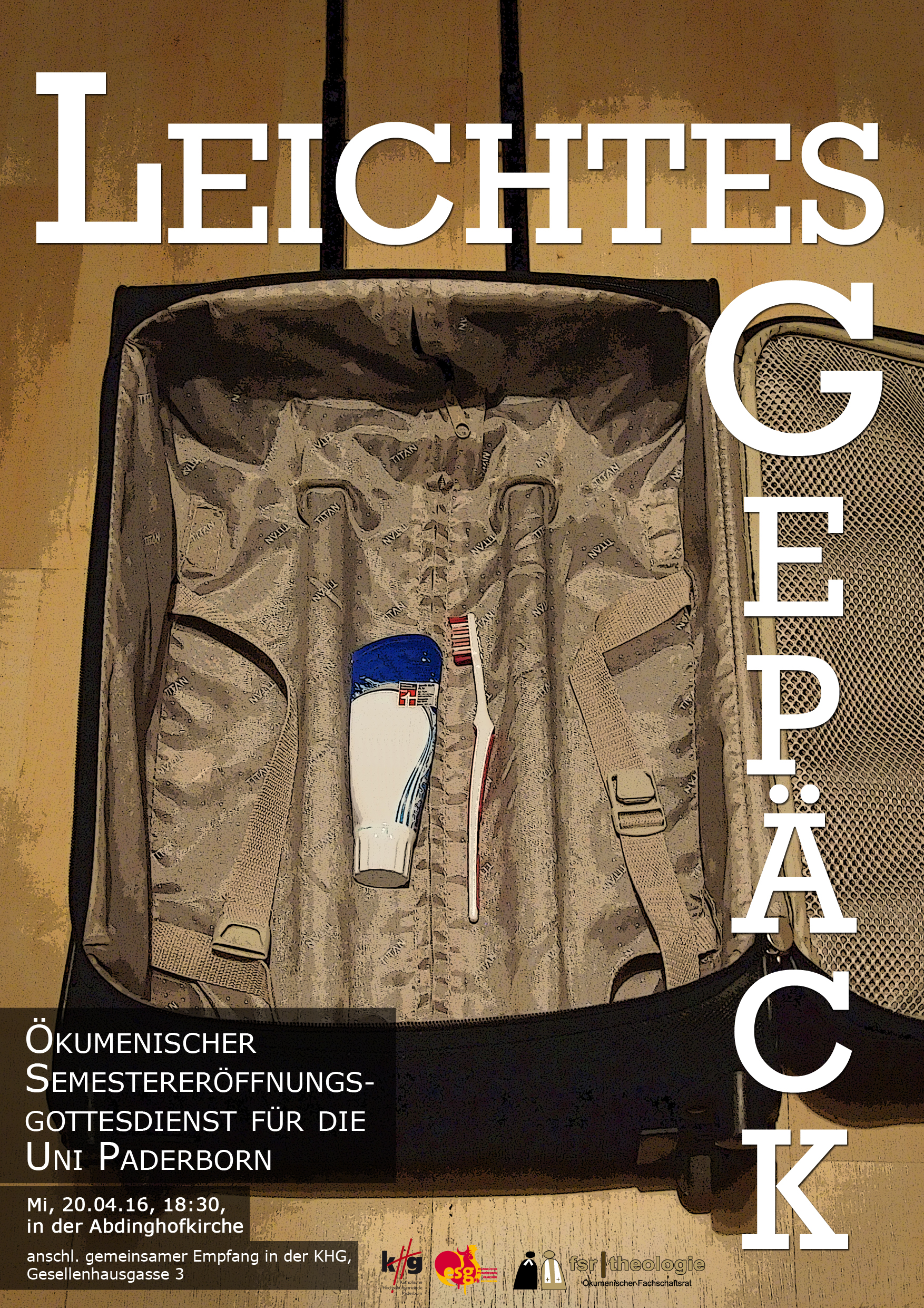 Bei diesem "Stationsgottesdienst" folgen die Besucher einer "Reise" durch die Kirche (Kirchenschiff, Altarraum, Krypta). Das Thema des Abends lautet in Anlehnung an den gleichnamigen "Silbermond"-Song "Leichtes Gepäck", die instrumentale Begleitung leisten Jan Schumacher (Orgel) und Thomas Koeper (Klarinette). Die Predigt hält KHG-Studentenpfarrer Nils Petrat. Anschließend wird zum gemeinsamen Empfang in die Räumlichkeiten der KHG (Gesellenhausgasse 3) eingeladen.