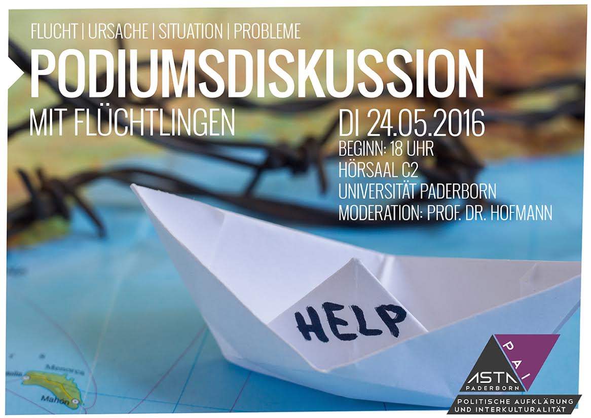 Der AStA-Referent für Politische Aufklärung & Interkulturalität organisiert für Dienstag, 24. Mai, 18 Uhr, im Hörsaal C2 eine „Podiumsdiskussion mit Flüchtlingen“.