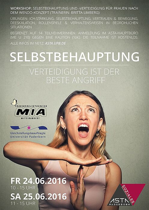 Wichtig: Der Kurs ist auf 14 Teilnehmerinnen begrenzt. Bei Interesse kann man sich im AStA-Hauptbüro in MU.210 gegen eine Kaution von 10 € anmelden – die Teilnahme am Kurs ist kostenlos. Der Platz im Workshop ist nur gesichert, wenn eine persönliche Anmeldung im AStA-Hauptbüro erfolgt.