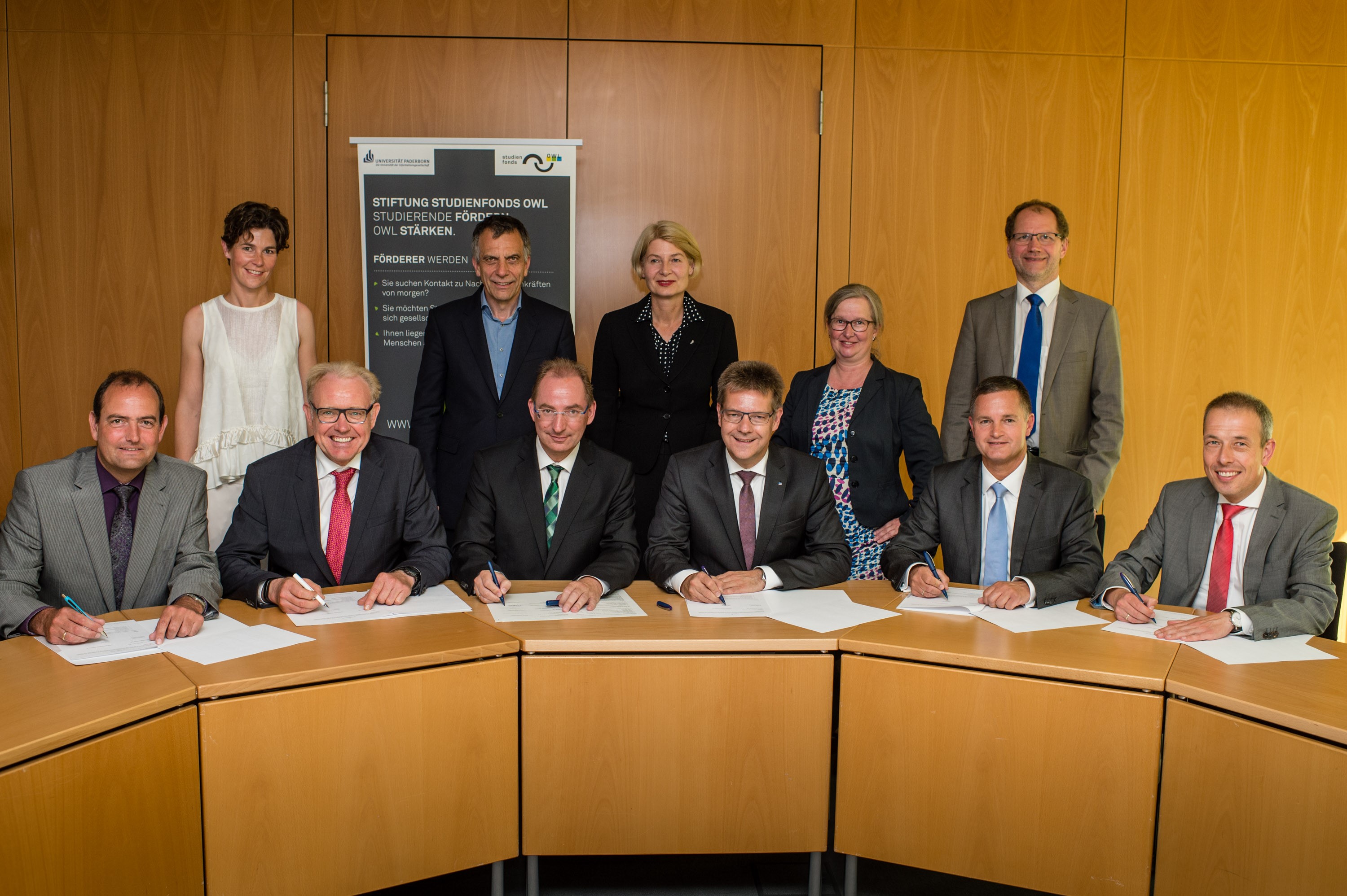 Am Rande der Jubiläumsveranstaltung zum 10-jährigen Bestehen der Stiftung Studienfonds OWL unterzeichneten die Vorstandsmitglieder der Volksbanken die Kooperationsvereinbarung. Die Stipendien können für eine bestimmte Hochschule oder einen Studiengang gewidmet werden. Die Stiftung Studienfonds OWL organisiert die Bewerbung und kümmert sich um die Auswahl der Studierenden. Alle Volksbanken haben sich für die Förderung von Studierenden an der Universität Paderborn entschieden. „Wir wollen mit unserem Engagement ein deutlich sichtbares Signal für unsere besondere Verbundenheit mit der Region setzen“ waren sich alle Vorstandsmitglieder einig. Das Stipendium beginnt für die Studierenden zum 1. Oktober 2016.