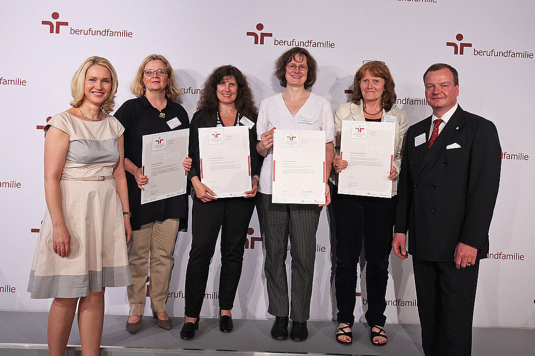 Am 23. Juni wurde der Universität Paderborn zum vierten Mal das Zertifikat „audit familiengerechte hochschule“ der berufundfamilie Service GmbH – eine Initiative der Gemeinnützigen Hertie-Stiftung – verliehen. In einer feierlichen Veranstaltung im Berliner Palais am Funkturm nahm Irmgard Pilgrim, Uni-Gleichstellungsbeauftragte, die Urkunde von Bundesfamilienministerin Manuela Schwesig und John-Philip Hammersen, Geschäftsführer der Gemeinnützigen Hertie-Stiftung, für die Hochschule entgegen.