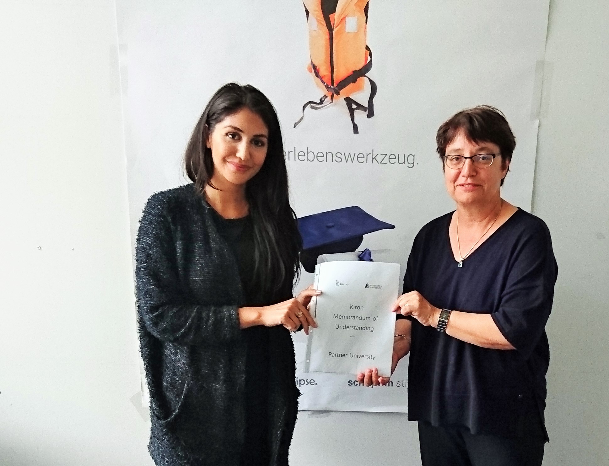 Prof. Dr. Birgit Riegraf, Vizepräsidentin für Studium, Lehre und Qualitätsmanagement der Universität Paderborn, und Hila Azadzoy von Kiron Open Higher Education haben am Freitag, 12. August, eine Kooperationsvereinbarung unterschrieben. Die Zusammenarbeit soll es Flüchtlingen erleichtern, mittels Online- und Präsenzstudium den Weg ins Studium zu finden. Die Kooperation dient dazu, Flüchtlingen den Zugang zum Studium zu vereinfachen, sie darin zu unterstützen, ein aufgrund von Fluchtgründen abgebrochenes Studium wieder aufzunehmen und fortzuführen, und es Flüchtlingen zu vereinfachen, einen Hochschulabschluss zu erwerben.