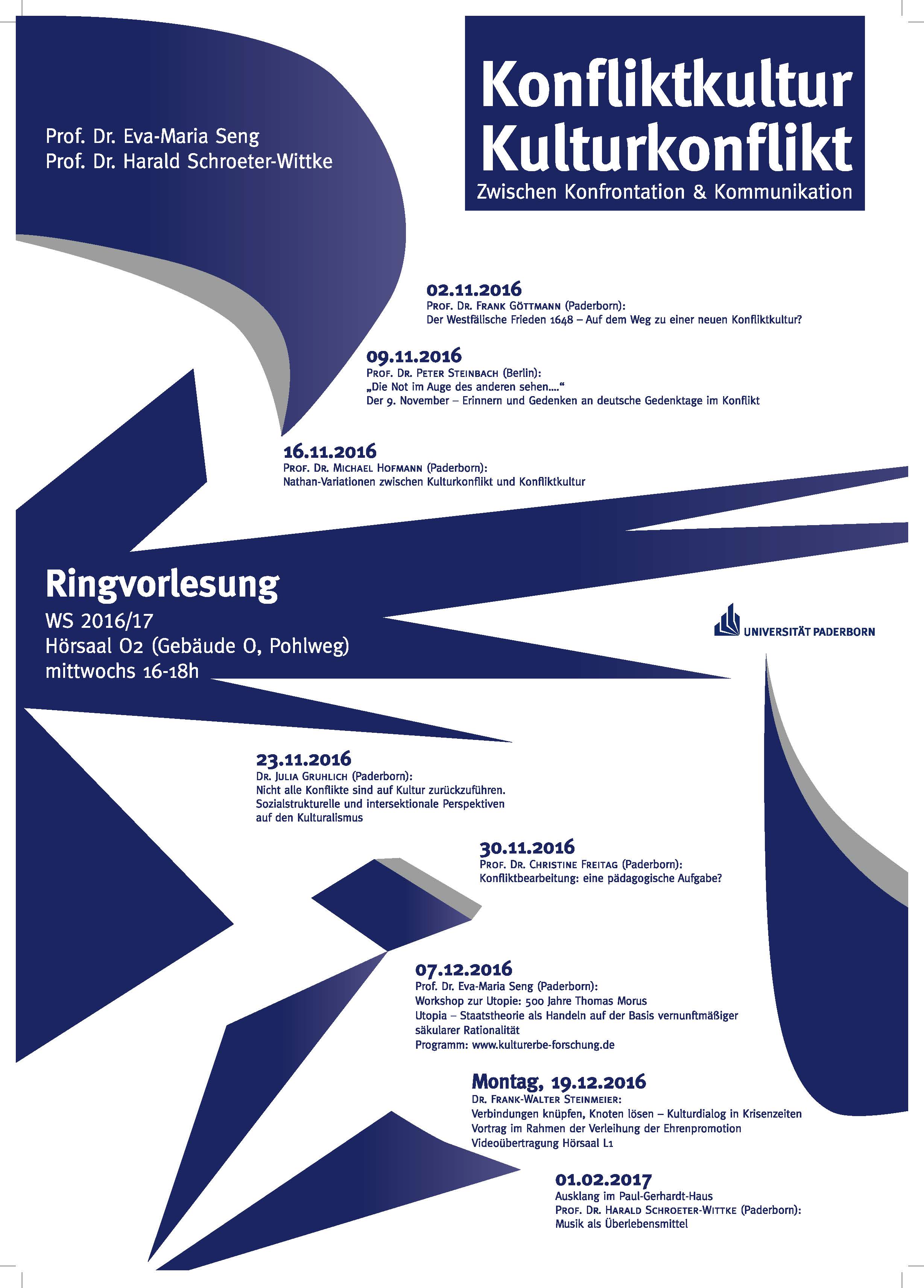 An der Universität Paderborn wird im Wintersemester von der Fakultät für Kulturwissenschaften die Ringvorlesung „Konfliktkultur – Kulturkonflikt. Zwischen Konfrontation & Kommunikation“ veranstaltet. In diesem Zusammenhang wird die Ehrendoktorwürde an Bundesaußenminister Dr. Frank-Walter Steinmeier verliehen. Steinmeier erhält die Ehrung u. a. für seinen Einsatz für die interkulturelle Verständigung. Die Vorträge finden vom 2. November bis 1. Februar mittwochs von 16 bis 18 Uhr im Gebäude O, Hörsaal O 2 (Pohlweg), statt. Am Montag, 19. Dezember, wird im Auditorium maximum in feierlichem Rahmen die Ehrendoktorwürde an Frank-Walter Steinmeier verliehen. Für Interessierte, die nicht Platz im Audimax finden, wird die Veranstaltung live in den Hörsaal L1 (Hörsaalgebäude L, Ecke Südring/Pohlweg) übertragen.