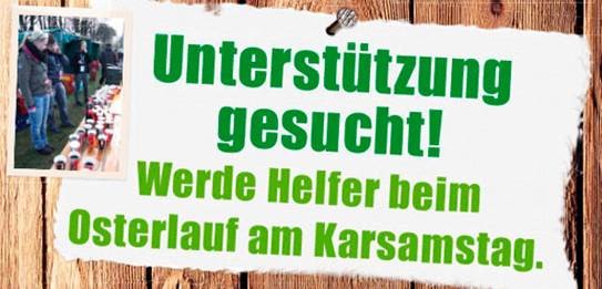 Um auch im kommenden Jahr wieder einen reibungslosen Ablauf garantieren zu können, ist das Osterlauf-Team auf zahlreiche Helferinnen und Helfer angewiesen und sucht Unterstützung. Helfer können sich in vielen verschiedenen Tätigkeitsbereichen einbringen: ob als Streckenposten, beim Auf- und Abbau der Messe, in der Um- und Nachmeldung oder an der Getränkeausgabe.