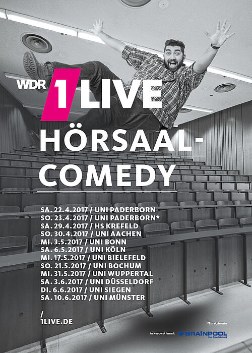 1LIVE bringt zum siebten Mal Deutschlands beste Comedy-Newcomer an die Unis im Sektor. Premiere der 1LIVE Hörsaal-Comedy ist am 22. April 2017 an der Uni Paderborn, das Finale findet am 10. Juni 2017 an der Uni Münster statt. Mit dabei sind Faisal Kawusi, Felix Lobrecht, Bastian Bielendorfer, Sandra da Vina und Tino Bomelino.