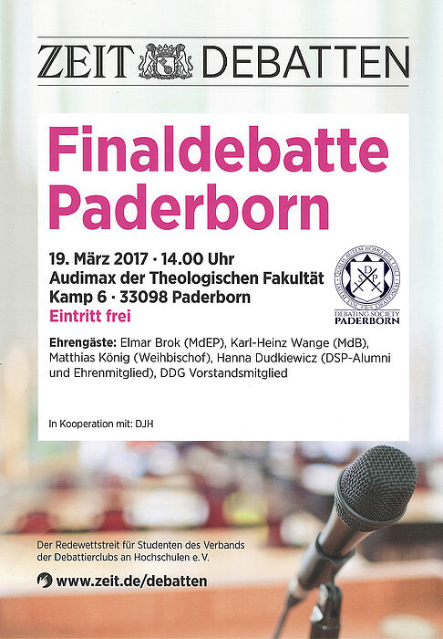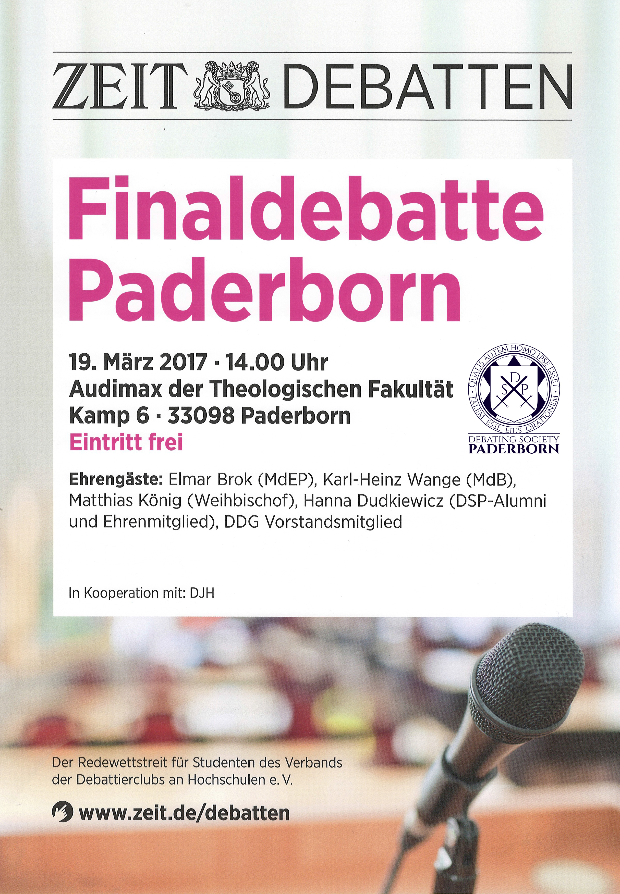 Die ZEIT DEBATTE ist eine prestigeträchtige Serie von Turnieren, die in der deutschsprachigen Debattiermeisterschaft ihren Höhepunkt findet. In diesem Jahr findet eines der Debattier-Turniere, in dem Fragestellungen aus Politik, Wirtschaft und Gesellschaft in jeweils siebenminütigen Reden behandelt werden, erstmalig in Paderborn statt. Ehrenjuroren sind Elmar Brok als Mitglied des Europaparlaments, der Bundestagsabgeordnete des Kreises Paderborn Karl-Heinz Wange, Weihbischof Matthias König, das Ehrenmitglied der DSP Hanna Dudkiewicz und ein Vorstandsmitglied der Deutschen Debattiergesellschaft.