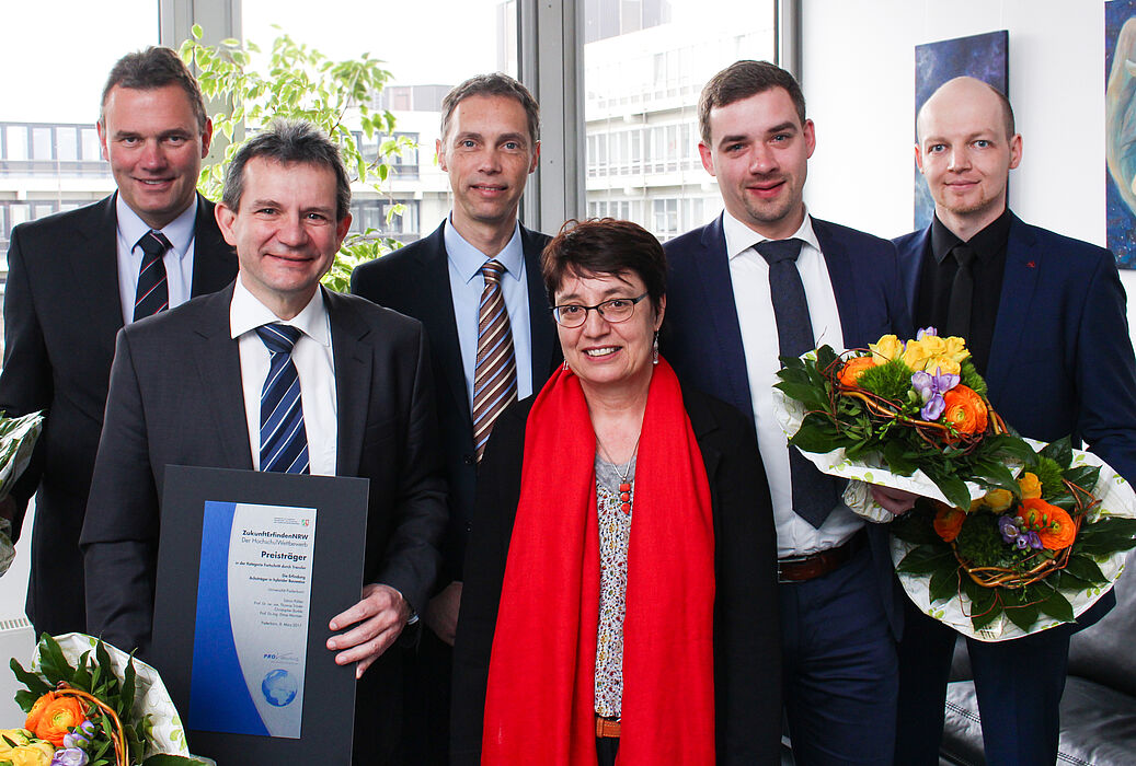 Foto (Universität Paderborn, Johannes Pauly): Preisverleihung ZukunftErfindenNRW (v. l.): Prof. Dr.-Ing. Elmar Moritzer, Prof. Dr. Thomas Tröster, Alfred Schillert, Prof. Dr. Birgit Riegraf, Simon Pöhler und Mattias Körner.