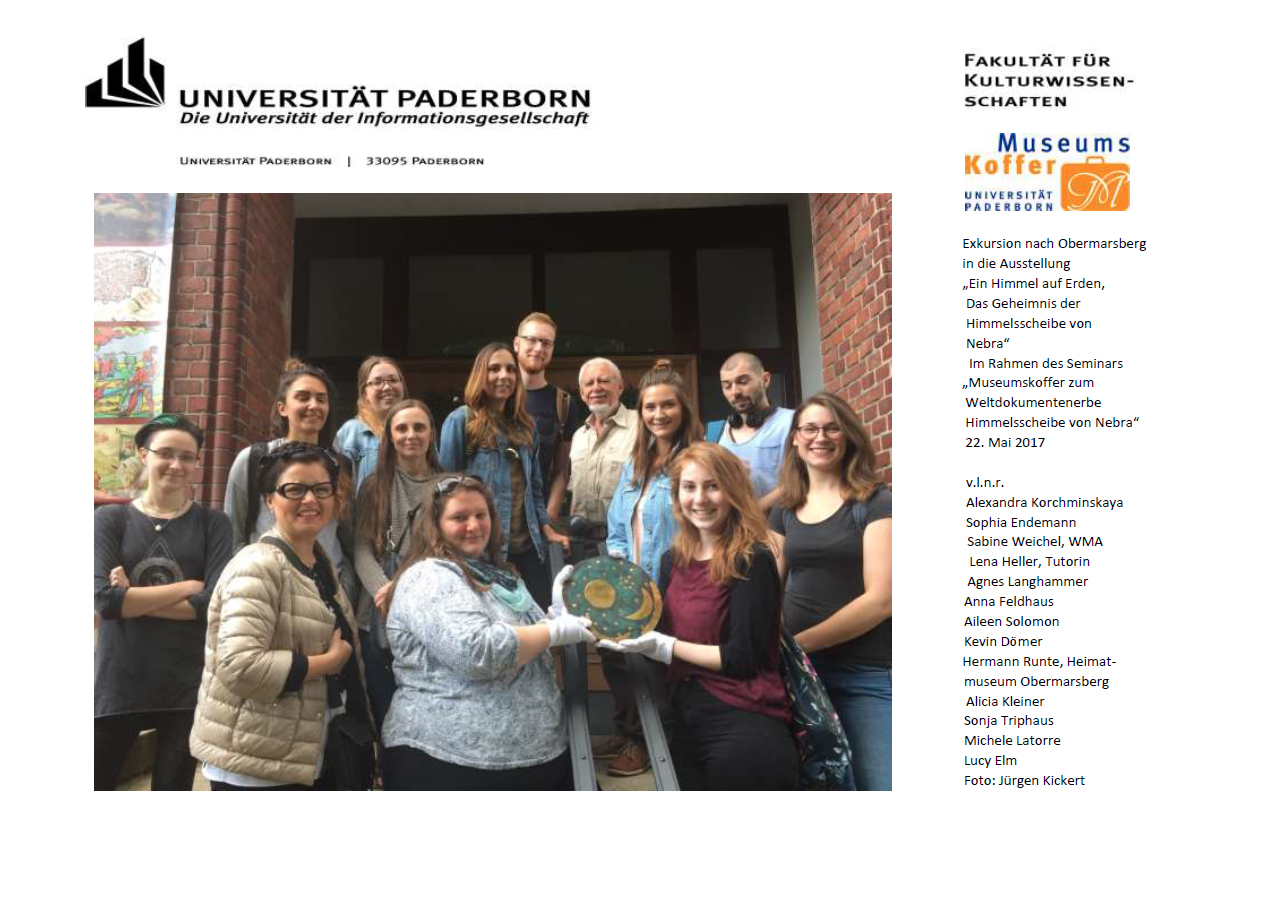 Im Rahmen des Seminars „Museumskoffer für das Weltdokumentenerbe Himmelsscheibe von Nebra“ unternahmen am 22. Mai Studierende des Fachs Kunst der Universität Paderborn unter Leitung von Sabine Weichel, Wissenschaftliche Mitarbeiterin am Lehrstuhl von Prof. Jutta Ströter-Bender, eine Exkursion in das Heimatmuseum Obermarsberg im Hochsauerlandkreis.