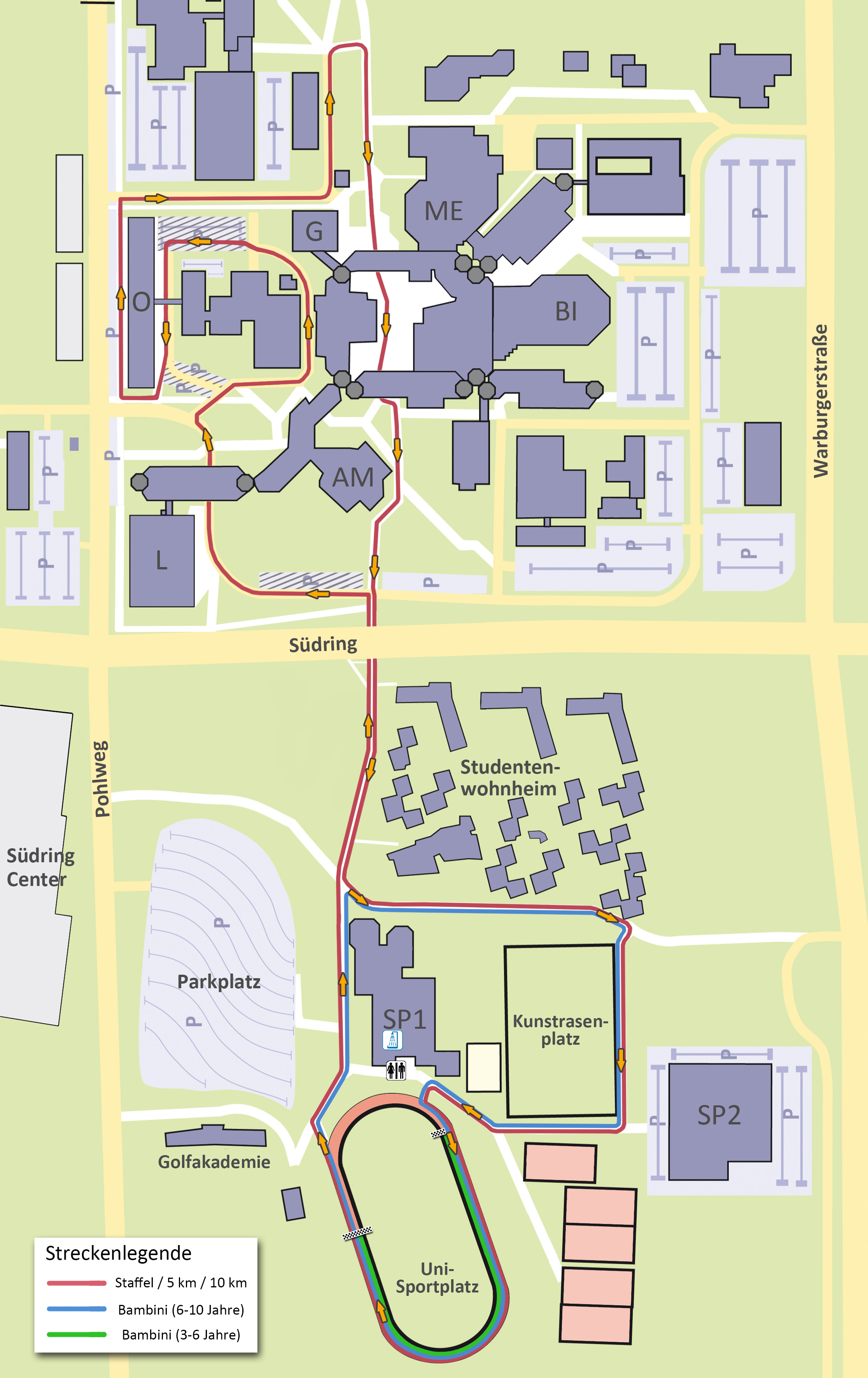 Die Strecke wurde leicht verändert – die Treppenstufen in der Nähe des Gebäude G müssen nicht mehr gelaufen werden (s. Streckenplan). Die Distanz einer Runde bleibt aber bei 2,5 km.