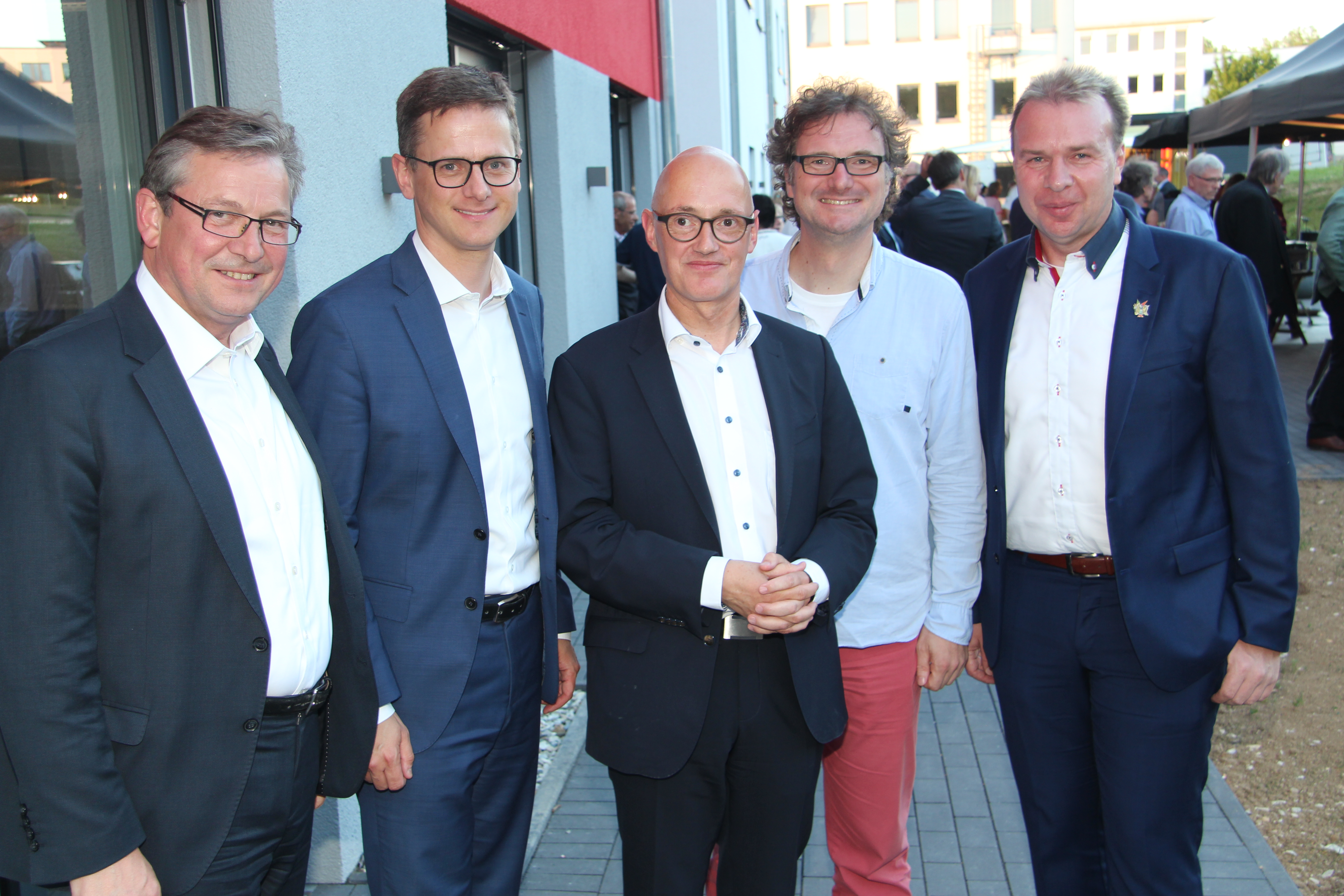 Foto: Trafen sich zum traditionellen MIT-Sommergespräch in der „garage 33“ (v. l.): Der Paderborner Bürgermeister Michael Dreier, der heimische Bundestagsabgeordnete Carsten Linnemann, Demoskop Hermann Binkert aus Erfurt, der Vize-Präsident der Universität Paderborn, Prof. Dr. Rüdiger Kabst, und der Vorsitzende der Mittelstandsvereinigung im Kreis Paderborn, Ulrich Lange.