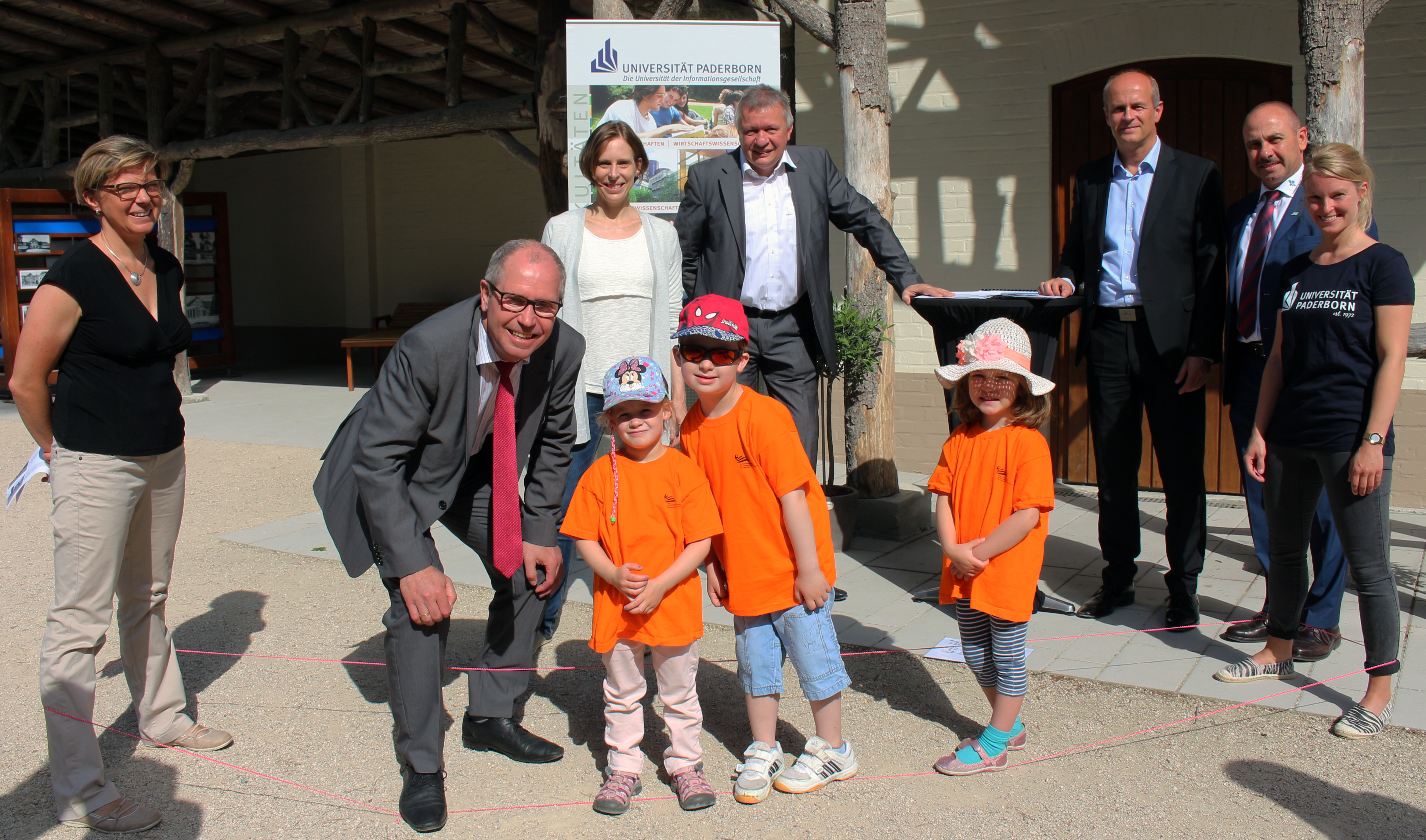 Foto (Heiko Appelbaum), v. l.: Nicole Satzinger, Manfred Müller (Landrat des Kreises Paderborn), Jun.-Prof. Dr. Miriam Kehne, Cecila, Malte, Achim Schäfer (Geschäftsführer MZG), Sveva, Michael Ennenbach, Andreas Bee (Bürgermeister der Stadt Bad Lippspringe) und die Studentin Maike Kaul.