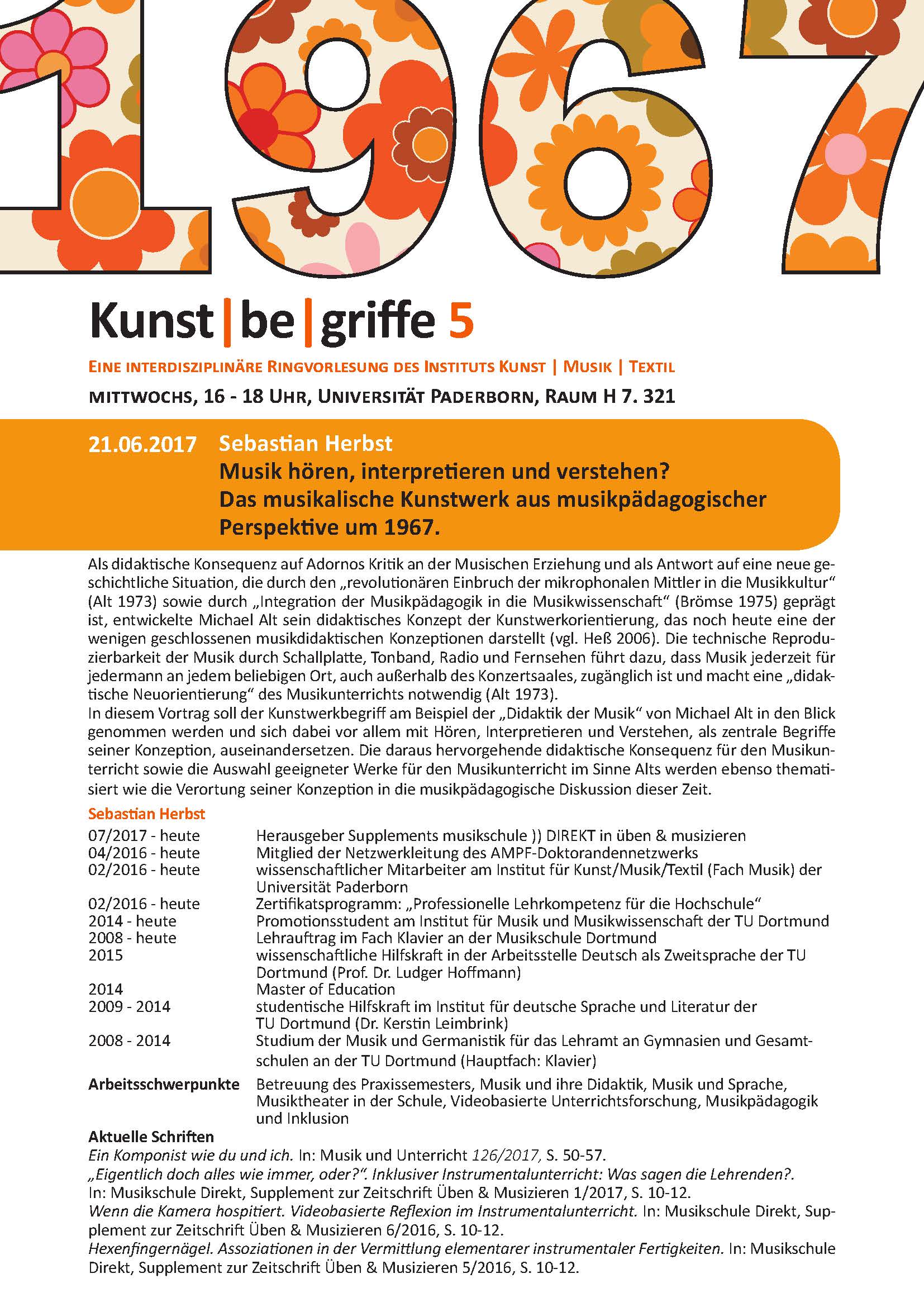 Am Mittwoch, 21. Juni, 16 bis 18 Uhr, hält Sebastian Herbst an der Universität Paderborn einen Vortrag zum Thema „Musik hören, interpretieren und verstehen? Das musikalische Kunstwerk aus musikpädagogischer Perspektive um 1967". Der Vortrag im Rahmen der interdisziplinären Ringvorlesung „Kunst(be)griffe 5“ des Instituts für Kunst, Musik und Textil findet im Raum H7.321 statt.