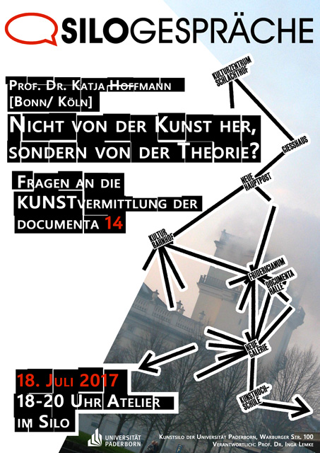 Am 18. Juli, 18 Uhr, bilden die SILOGESPRÄCHE des Fachs Kunst den Rahmen eines Vortrags von Prof. Dr. Katja Hoffmann unter dem Titel „Nicht von der Kunst her, sondern von der Theorie? Fragen an die KUNSTvermittlung der documenta 14“. Zum Vortrag und der anschließenden Diskussion sind Studierende und Lehrende der Universität Paderborn sowie Interessierte aus Stadt und Region herzlich eingeladen.
