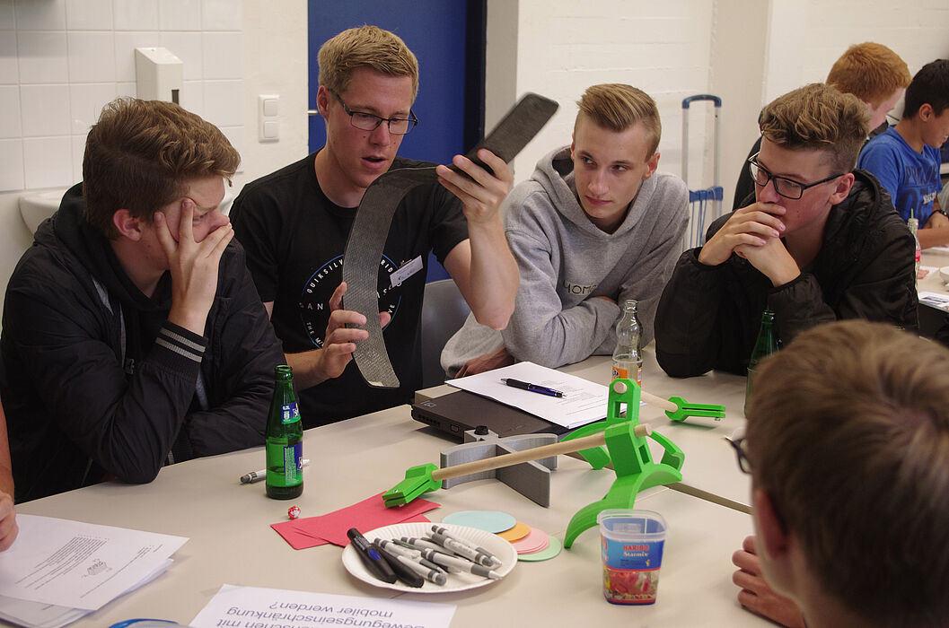 „Was könnte das wohl sein?“ Björn Landgrebe hält ein graues Kunststoffschwert nach oben. An dem Thementisch des jungen Wissenschaftlers geht es um Hilfsmittel für Sportler mit eingeschränkter Mobilität. Aber für welche Sportart braucht man ein solches Teil? Zehn Schülerinnen und Schüler rätseln wild durcheinander. „Hockey“, schlägt schließlich ein Schüler vor. Tatsächlich: Bringt man das schwertförmige Kunststoffteil vorne an einem Rollstuhl an, kann ein gehbehinderter Sportler damit einen Puck schießen. Inspiriert von diesem Beispiel fallen den Jugendlichen noch mehr Hilfsmittel ein, mit denen behinderte Menschen oder Senioren Sport treiben könnten. Was ist zum Beispiel mit einer Stoßhilfe für gehbehinderte Senioren, die gerne kegeln?