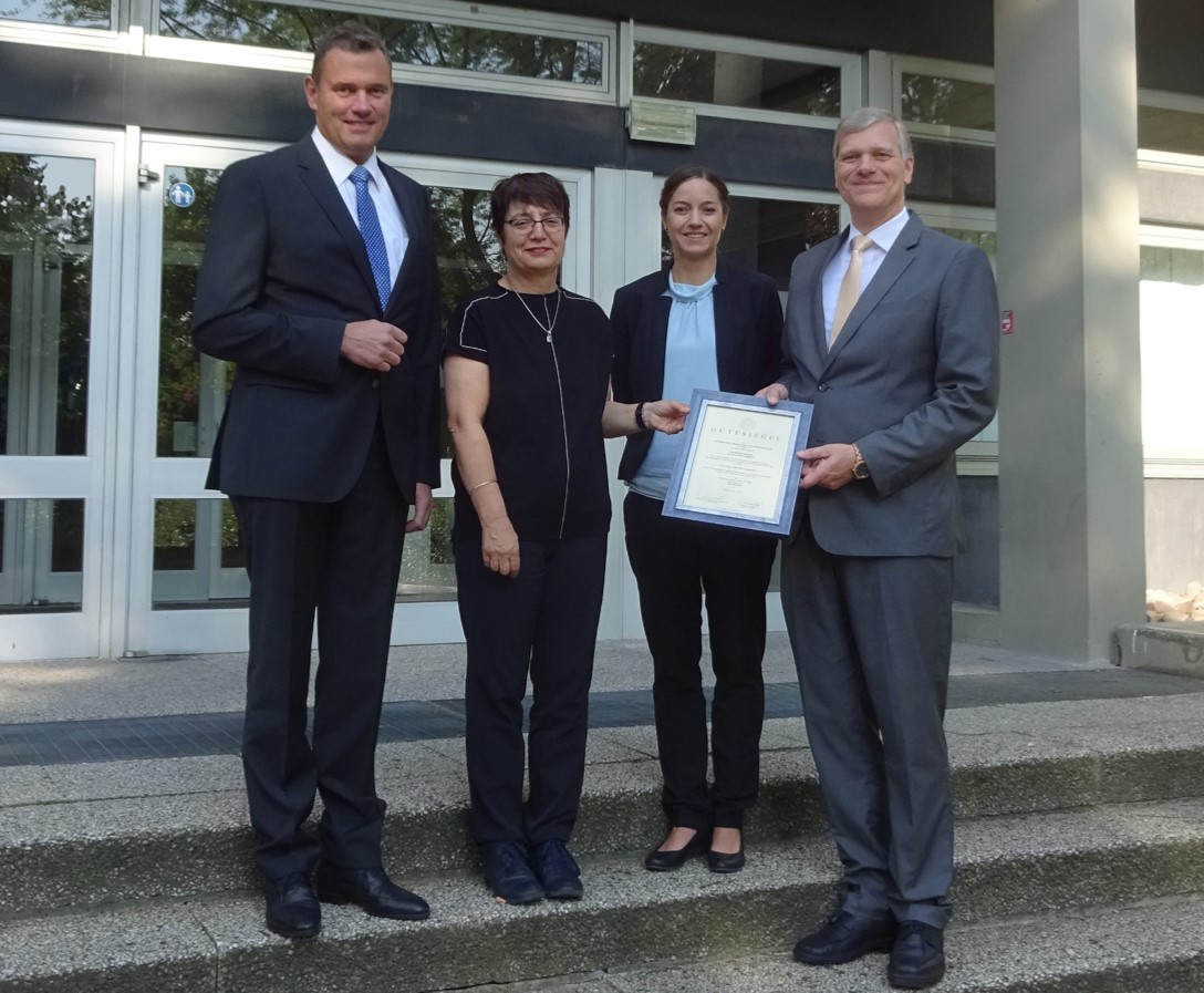 Das Foto zeigt (v. l.) Prof. Dr.-Ing. Moritzer (Kunststofftechnik Paderborn), Prof. Dr. Birgit Riegraf (Vizepräsidentin für Lehre, Studium und Qualitätsmanagement), Dr.-Ing. Bianka Jacobkersting (Geschäftsführerin der Fakultät für Maschinenbau) und Prof. Dr.-Ing. Volker Schöppner (Dekan der Fakultät für Maschinenbau).