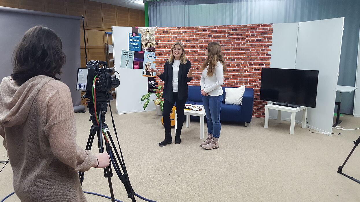 Foto (Jacqueline Kannengießer): Studentin Birte Meine filmt die Moderatorinnen Friederike Hoffmann (l.) und Pia Nina Scherwinski bei der Generalprobe von „UNIversum“.