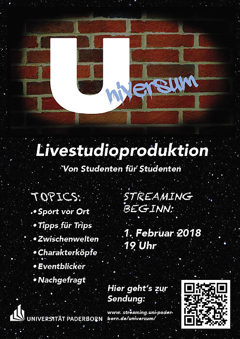 Studierende aus dem Seminar „Livestudioproduktion Fernsehen“ des Institutes für Medienwissenschaften der Universität Paderborn präsentieren am 1. Februar um 19 Uhr eine Live-Sendung mit dem Titel „UNIversum – Von Studenten für Studenten“.