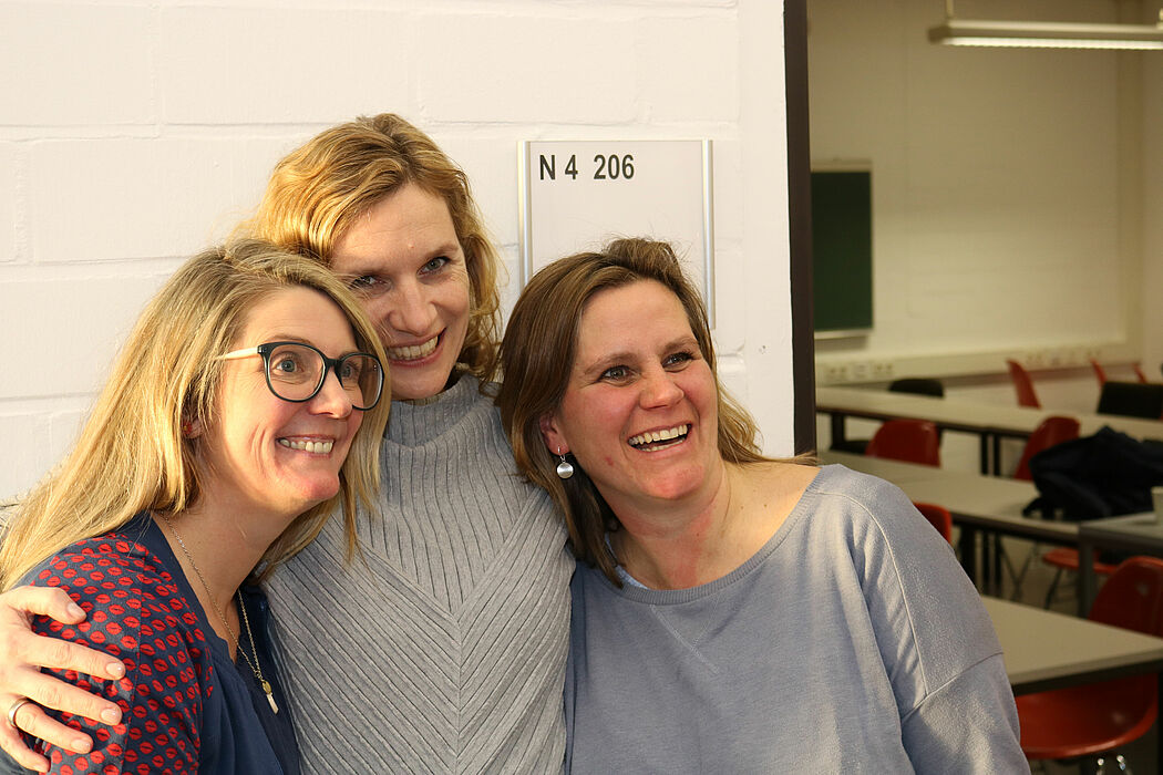 Als besonders muntere Truppe erwiesen sich auch die Teilnehmerinnen und Teilnehmer der zweiten Campus-Tour: Mehr als zwanzig ehemalige Geographie-Tourismus-Studentinnen und -Studenten trafen sich zum ersten Mal seit Studienende wieder. In den 1990 Jahren waren sie an der Universität-Gesamthochschule eingeschrieben und hatten sich auch für die studentische Initiative ihres Studiengangs, „S.T.U.P.“, engagiert. Dementsprechend viel hatten sich die Ehemaligen zu erzählen. In den Gesprächspausen haben sie dann Wissenswertes über die Geschichte und Entwicklung der UPB sowie Infos zu den neuen Gebäuden erhalten. Vieles auf dem Gelände kommt ihnen noch bekannt vor, auch wenn die Veränderungen im Detail liegen: Verschwunden sind z. B. die orangefarbenen Pinnwände mit den Klausurlisten, die an vielen Stellen in der Uni hingen. Sie erinnern sich: „Mit einem mulmigen Gefühl ist man damals dorthin gegangen und hat seine Matrikelnummer mit zittrigen Fingern gesucht.“ Zum Abschluss ging es in „ihren“ alten Seminarraum N4.206, der mit den orangefarbenen Stühlen noch genauso aussieht wie damals. Ein giftgrünes, selbstgemischtes Getränk aus S.T.U.P.-Partyzeiten wird zum Anstoßen ausgegeben und alte Geschichten aus dem Studium werden ausgepackt: von der alten Dame, die einer Studentin den Schlafplatz ihres verstorbenen Mannes angeboten hat oder von der fußballbegeisterten WG, die ihr Wohnzimmer in einen Fußballplatz umgewandelt hat – komplett mit Kunstrasen, Trainerbank und Eckfahne. „Die zentrale Studienberatung hat uns damals ja vom Tourismus-Studium abgeraten. Aber arbeitslos – wie uns prophezeit wurde – sind wir nicht geworden“, berichtet eine Ehemalige. Heute arbeiten sie in völlig unterschiedlichen Bereichen – Reise, Personal, Marketing – in Unternehmen in ganz Deutschland.