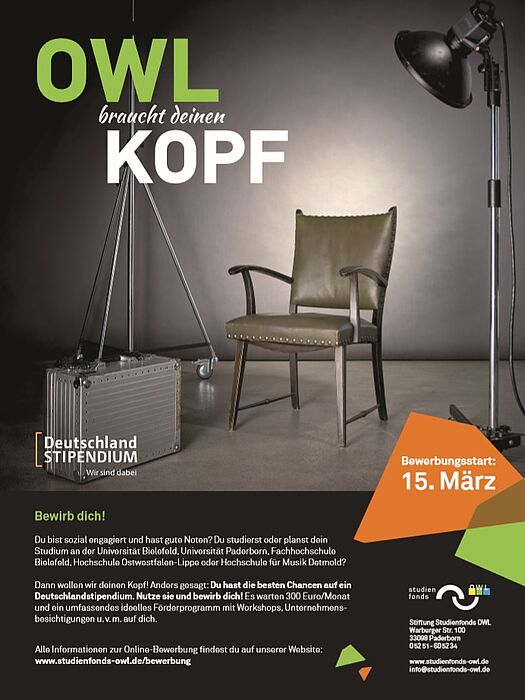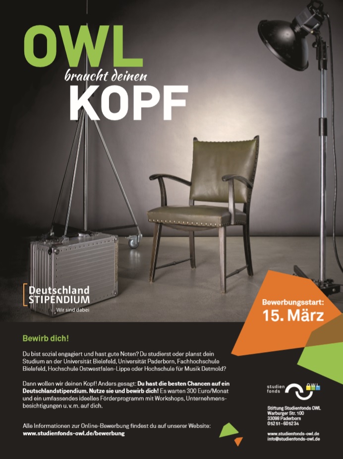 Die Geschäftsstelle der Stiftung Studienfonds OWL wirbt in der Region für mehr Unterstützerinnen und Unterstützer bei der Finanzierung von Stipendien. Ziel ist es, bis zum Beginn des neuen Förderjahres möglichst viele neue Stipendien zu ermöglichen. Der Bund stellt den fünf am Studienfonds OWL beteiligten Hochschulen Geld für 900 Stipendien zur Verfügung, d. h. mehr als die Hälfte der Mittel kann bislang mangels privater Spender nicht abgerufen werden. Dies soll sich ändern. Unternehmen, Stiftungen, Vereine, Privatpersonen – jeder kann sich beteiligen und Förderer werden und dazu beitragen, leistungsstarke und engagierte junge Menschen zu unterstützen