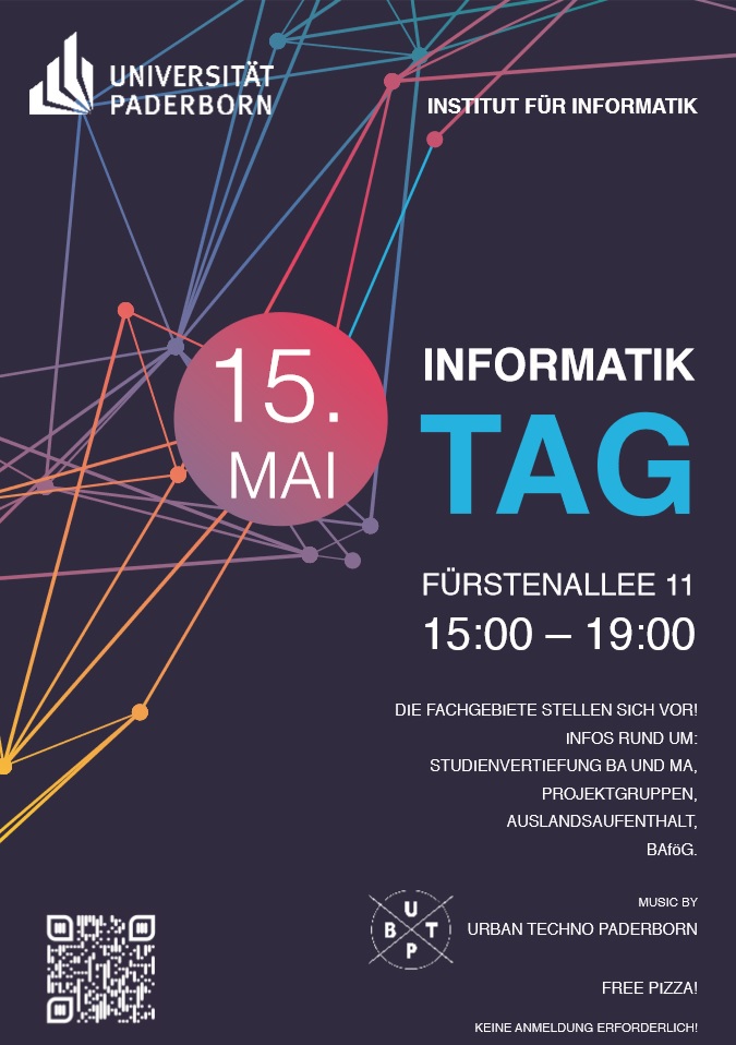 Wann und wo bietet sich ein Auslandsaufenthalt an, in welchem Fachgebiet können Abschlussarbeiten geschrieben werden, wer sucht Studentische Hilfskräfte (SHKs) und welche Projektgruppen könnten im Studium voranbringen? Diese und viele weitere Fragen werden beantwortet. Auch zum Master, zur Vertiefung im Bachelor und dem Bafög wird ein Überblick gegeben. Viele der Informatik-Fachgebiete werden vor Ort sein, ihre Forschung präsentieren und für Fragen bereit stehen.