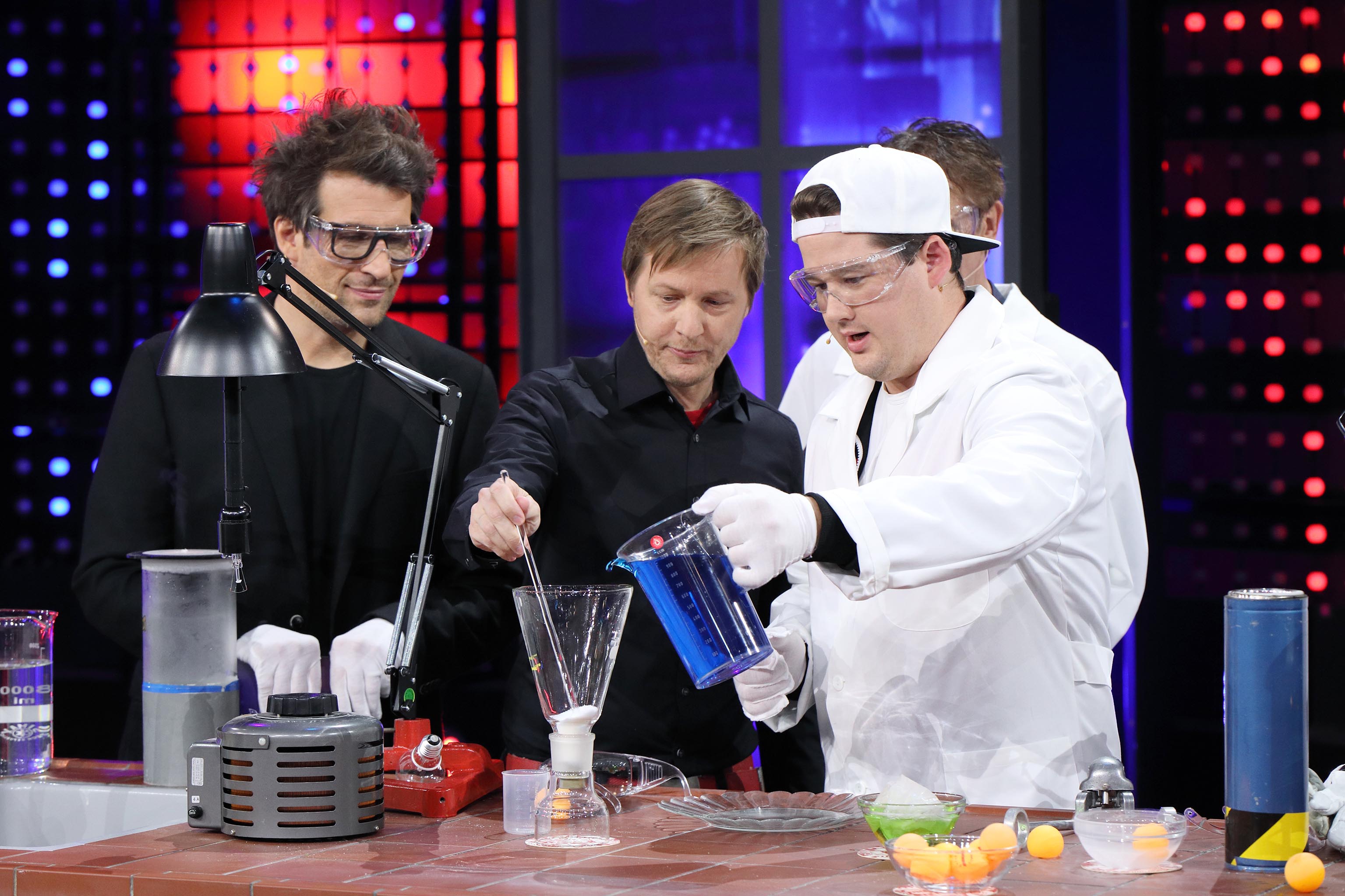 Foto2: (MG RTL D / Stefan Gregorowius): Daniel Hartwich (l.) beobachtet, wie Chris Tall (r.) Dr. Marc Sacher (m.) bei einem Experiment mit Superabsorbern hilft.