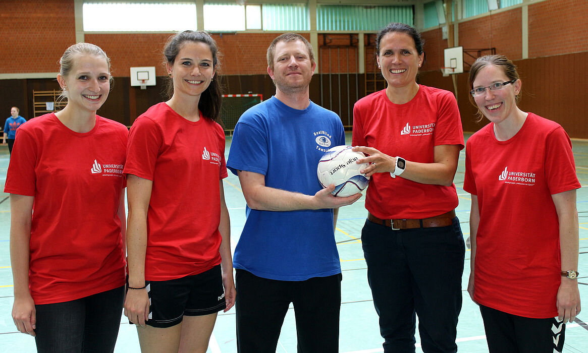 Foto (Heiko Appelbaum): Haben den Aktionstag Blindenfußball ins Rollen gebracht (v. l.): Sara Linnemann und Lisa Schäfer (Mitarbeiterinnen Arbeitsgebiet „Inklusion im Sport“), Marcel Heim, Prof. Dr. Sabine Radtke und Cindy Adolph-Börs (Mitarbeiterin Arbeitsgebiet „Inklusion im Sport“).