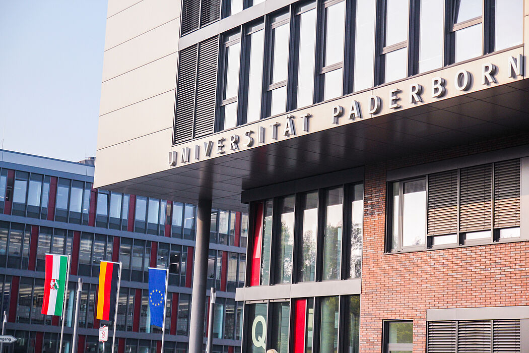 Heute vor 72 Jahren wurde das Land Nordrhein-Westfalen gegründet. Daher wehen am Haupteingang der UPB aktuell wieder die Fahnen des Bundeslandes, der Bundesrepublik Deutschland und die Europaflagge.
