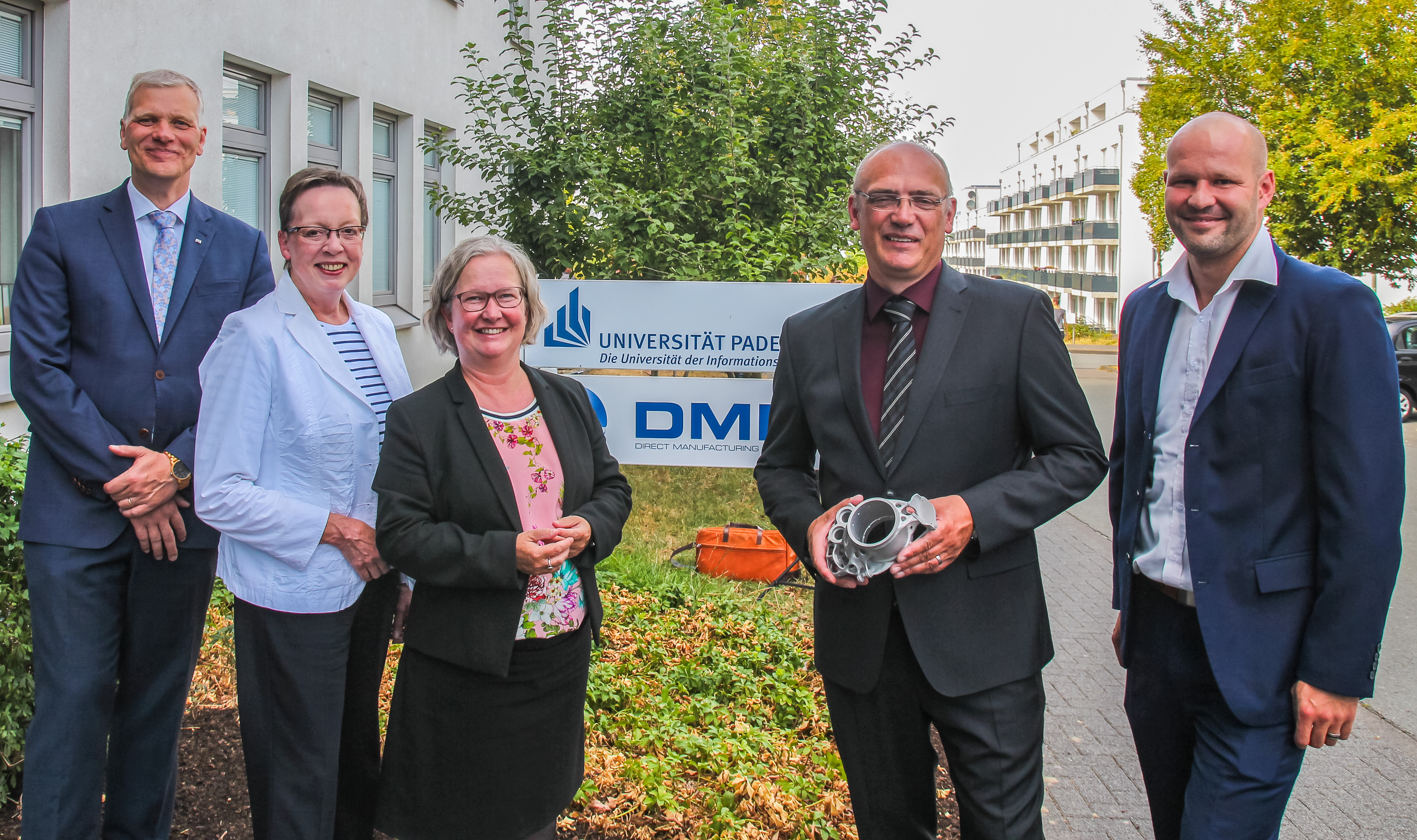 Mit 5,34 Millionen Euro fördern das Land NRW und die Europäische Union ein neues Forschungsprojekt der Universität Paderborn zu additiver Fertigung. Am Mittwoch, 29. August, übergab Regierungspräsidentin Marianne Thomann-Stahl während einer Informationsveranstaltung am „Direct Manufacturing Research Center“ (DMRC) an der Universität einen entsprechenden Förderbescheid an die zuständigen Professoren. Das Projekt „Industrial Additive Manufacturing in North Rhine-Westphalia“ (iAMnrw-Materials) konzentriert sich auf die sogenannte additive Fertigung, auch bekannt als 3D-Druck. Es startet am 1. September 2018 und hat eine Laufzeit von drei Jahren.