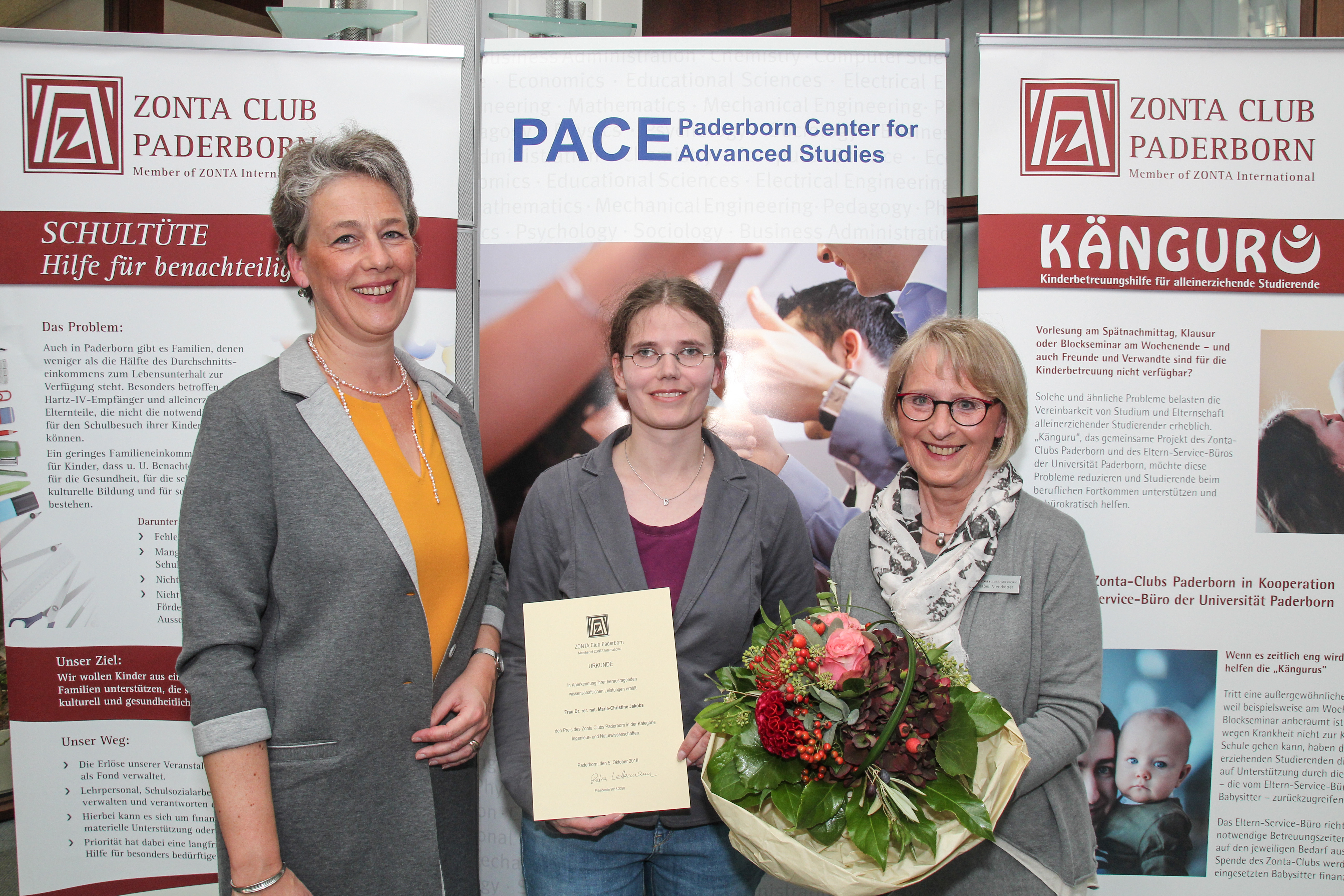 Am Freitag, 5. Oktober, hat der ZONTA Club Paderborn in einem feierlichen Rahmen Dr. Marie-Christine Jakobs, Absolventin des Paderborn Center for Advanced Studies (PACE) der Universität Paderborn, mit dem ZONTA Wissenschaftspreis ausgezeichnet. Der mit 1.500 Euro dotierte Preis richtet sich an Doktorandinnen, die herausragende Leistungen in der Wissenschaft erzielt haben. ZONTA ist ein internationales und neutrales Netzwerk, das es sich zur Aufgabe macht, Frauen in den Bereichen Politik, Wirtschaft, Bildung, Gesundheit und Recht zu fördern und Bedürftigen zu helfen.