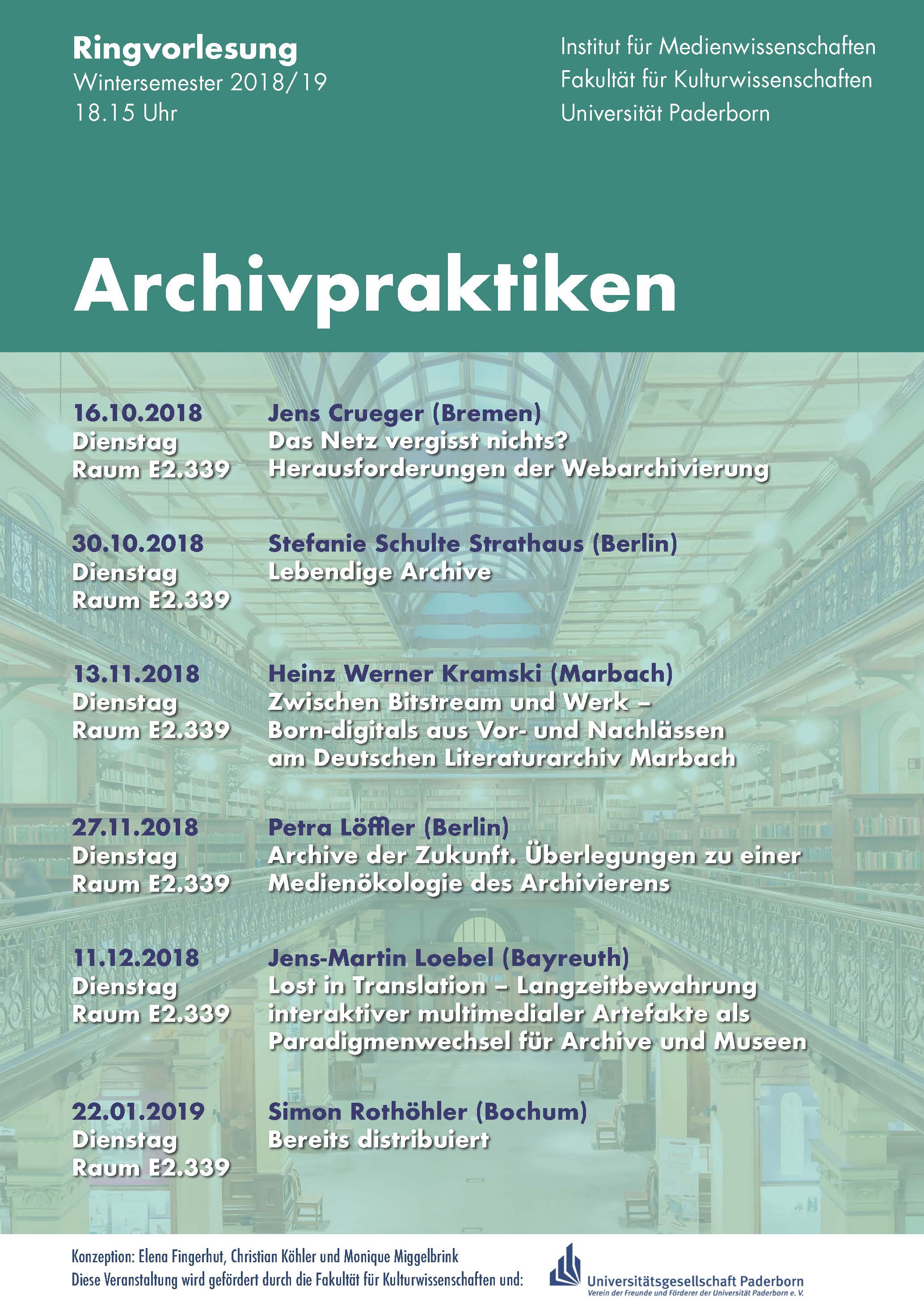 Die Ringvorlesung des Instituts für Medienwissenschaften "Archivpraktiken: Sammeln und Speichern unter digitalen Bedingungen" findet jeweils im Raum E2.339, 18.15 Uhr, statt.