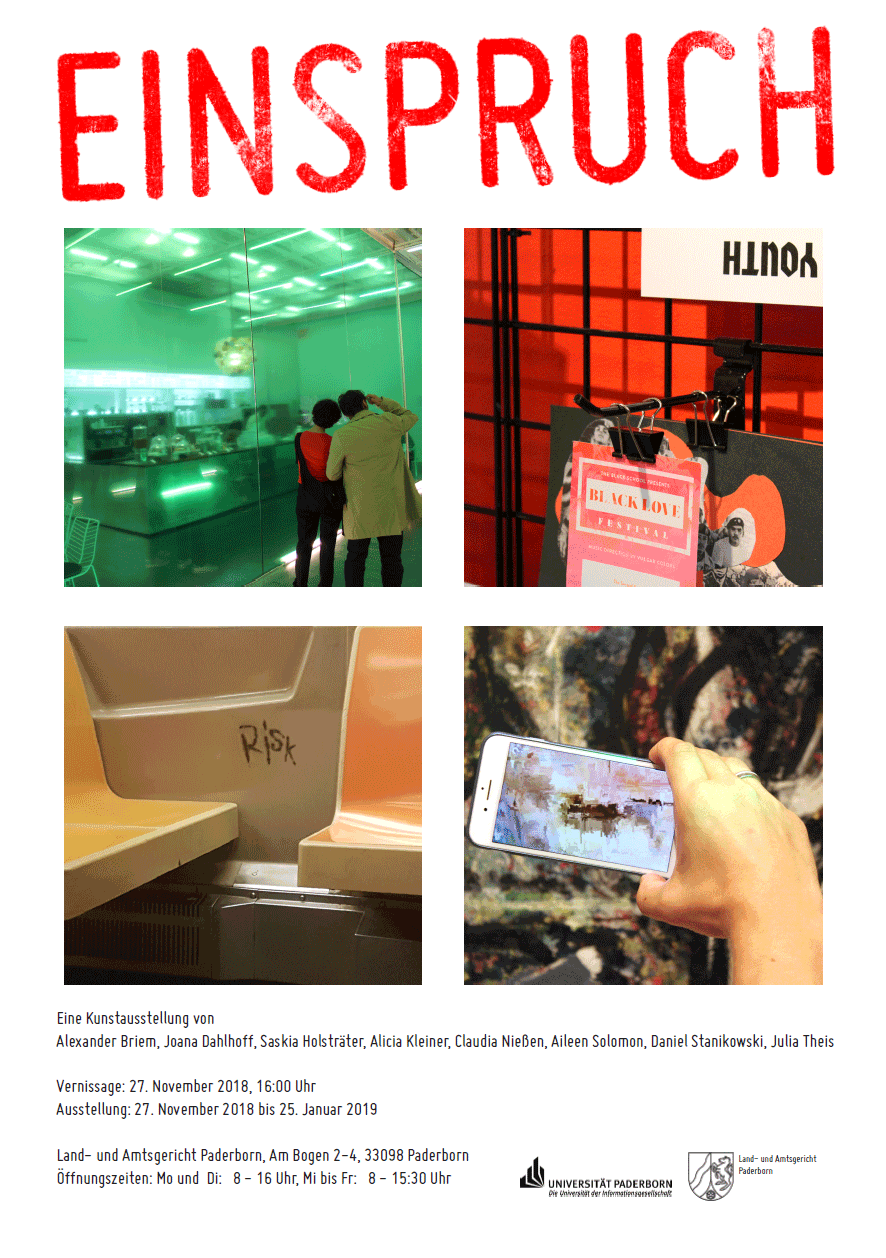 Von Dienstag, 27. November, bis zum 25. Januar ist die Kunstausstellung EINSPRUCH im Land- und Amtsgericht Paderborn (Am Bogen 2-4, 33098 Paderborn) zu sehen.