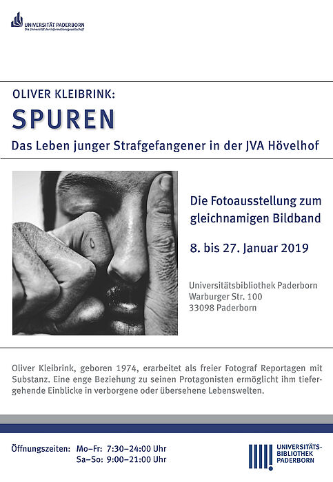 Am Dienstag, 8. Januar, findet um 17 Uhr die Eröffnung der Ausstellung „SPUREN – Das Leben junger Strafgefangener in der JVA Hövelhof“ des Paderborner Fotografen Oliver Kleibrink in der Universitätsbibliothek Paderborn statt. Die Ausstellung kann anschließend bis Sonntag, 27. Januar, während der Öffnungszeiten der Universitätsbibliothek besucht werden: Montag bis Freitag: 7.30 bis 24 Uhr, Samstag bis Sonntag: 9 bis 21 Uhr.