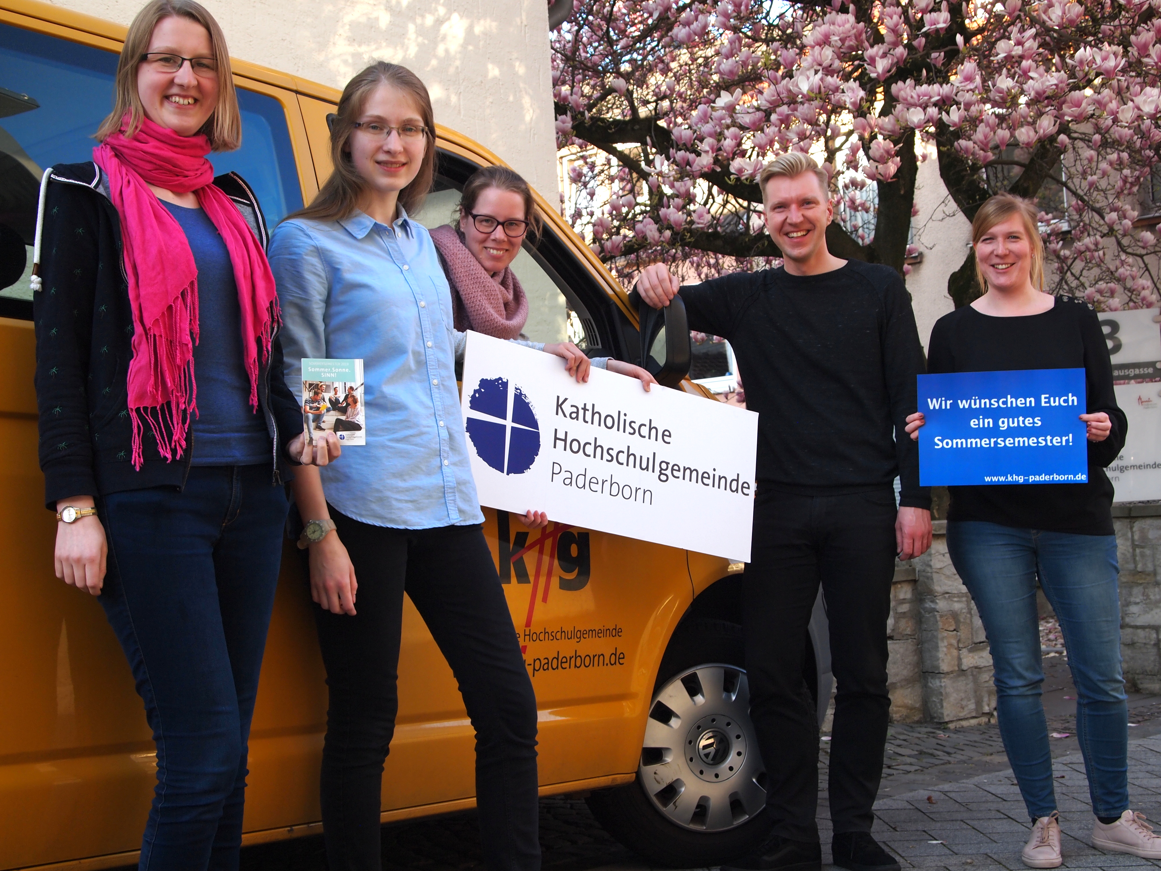 Foto (KHG Paderborn): Sommer, Sonne, Sinn: (v. l.) Leonie Wulf, Elisabeth Schröttke, Inga Bolte, Studierendenpfarrer Nils Petrat und KHG-Referentin Simone Wiedeking.