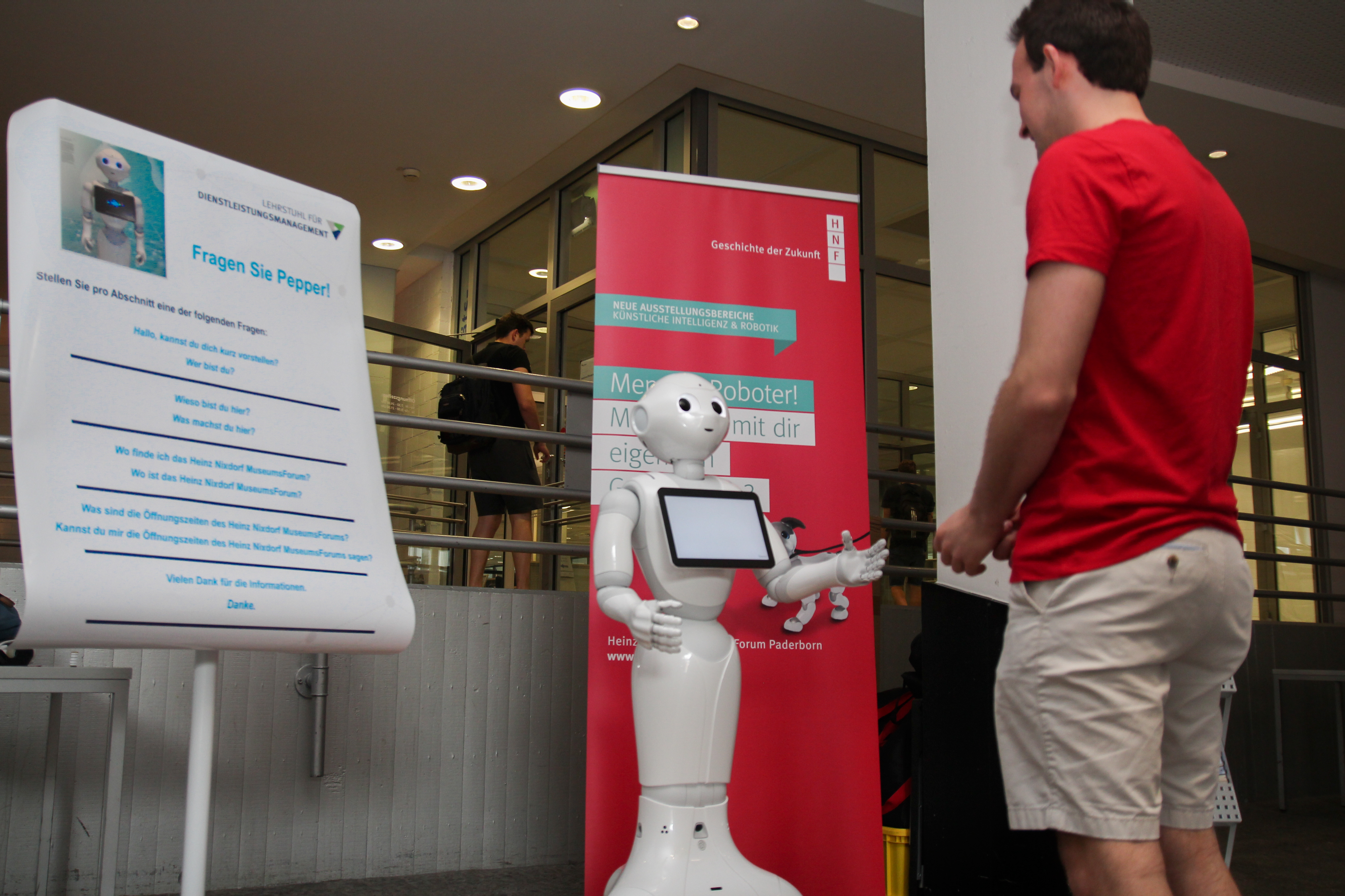 Am Mittwoch, 5. Juni, war der Roboter „Pepper“ aus dem Heinz Nixdorf MuseumsForum (HNF) an der Universität, um sich im Rahmen eines Experimentes mit Probanden zu unterhalten. Studierende untersuchen im Kontext eines Seminars am Lehrstuhl für Dienstleistungsmanagement von Prof. Dr. Nancy Wünderlich und in Kooperation mit dem HNF, wie Menschen mit dem Roboter interagieren. Für die Untersuchung an der Uni wurden Frage- und Auswertungsbögen vorbereitet, die nun weitere Aufschlüsse über die Mensch-Roboter-Beziehung geben sollen. Außerdem wurden im Vorfeld mehrere Experimente mit „Pepper“ gemacht. Für die Studie an der Uni wurde u. a. beobachtet, wie die Studierenden mit dem Roboter in Kontakt treten, wie sie emotional auf ihn reagieren, wie viel Abstand sie zu ihm halten und ob sich diese Parameter im Laufe der Unterhaltung verändern. Studierende, die an diesem Projekt mitarbeiten, führen darüber hinaus weitere qualitative und quantitative Analysen durch, um zukünftig valide Daten darüber zu gewinnen, wie Pepper von Menschen wahrgenommen wird und wo mögliche Einsatzgebiete des Roboters liegen.