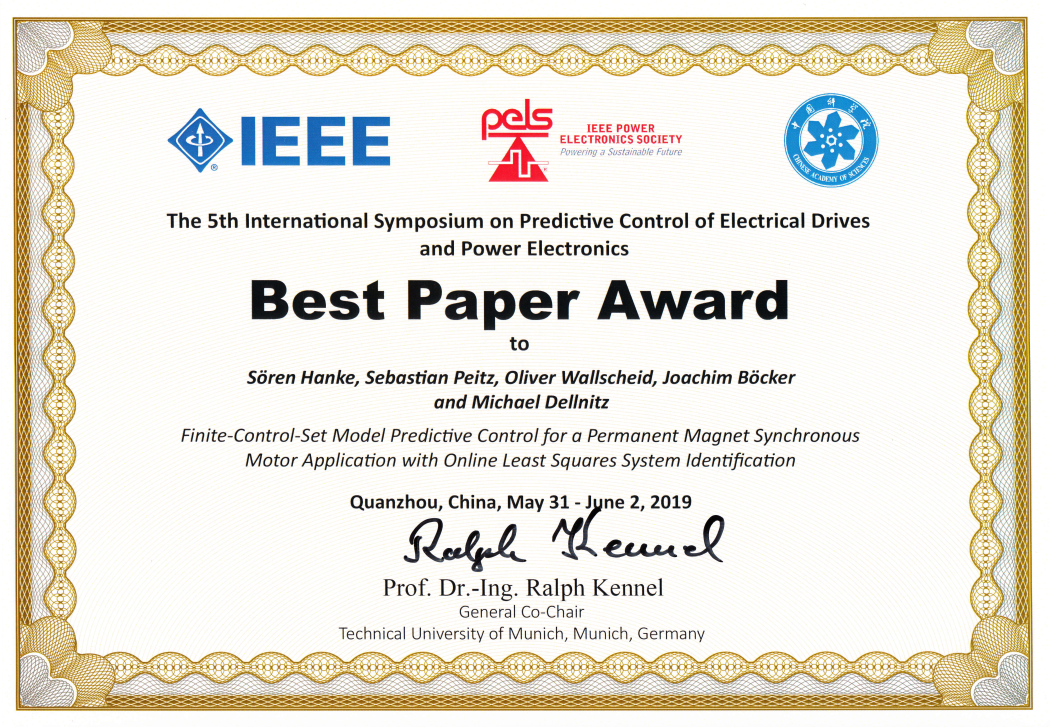 Während des diesjährigen “lnternational Symposium on Predictive Control of Electrical Drives and Power Electronics (PRECEDE)”, das in Quanzhou (China) Anfang Juni stattfand, hat Sören Hanke vom Fachgebiet für Leistungselektronik und Elektrische Antriebstechnik (LEA) den Best Paper Award verliehen bekommen. Sein Arbeitspapier mit dem Titel „Finite-Control-Set Model Predictive Control for a Permanent Magnet Synchronous Motor Application with Online Least Squares System ldentification“ adressiert moderne Regelungsverfahren für elektrische Antriebe, die neben einer maximalen Systemdynamik auf die kontinuierliche Anpassung an veränderliche Betriebsbedingungen (z. B. Temperaturschwanken oder Exemplarstreuung) abzielt, um auch unter anspruchsvollen Umgebungsbedingungen einen sicheren Systembetrieb zu gewährleisten. Die hieraus abgeleitete Regelungssoftware kann beispielsweise zur Ansteuerung von elektrischen Antrieben in Fahrzeugen aber auch industriellen Produktionsanlagen (Servotechnik) verwendet werden.
