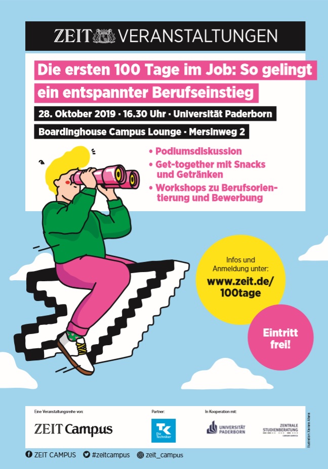 Wie gelingt der erfolgreiche Start ins Berufsleben? Darüber informieren Zeit Campus und die Zentrale Studienberatung der Universität Paderborn in Kooperation mit der Techniker Krankenkasse am Montag, 28. Oktober, ab 16.30 Uhr im Boardinghouse der Campus Lounge (Mersinweg 2). Studierende und Absolventen aller Fachrichtungen können sich mit Experten der Zeit, von Unternehmen und der Techniker Krankenkasse austauschen. Auf dem Programm stehen eine Podiumsdiskussion und Workshops zu den Themen Berufsorientierung und Bewerbung. Zwischen der Diskussion und den Workshops gibts ein Get-together mit Snacks und Getränken.