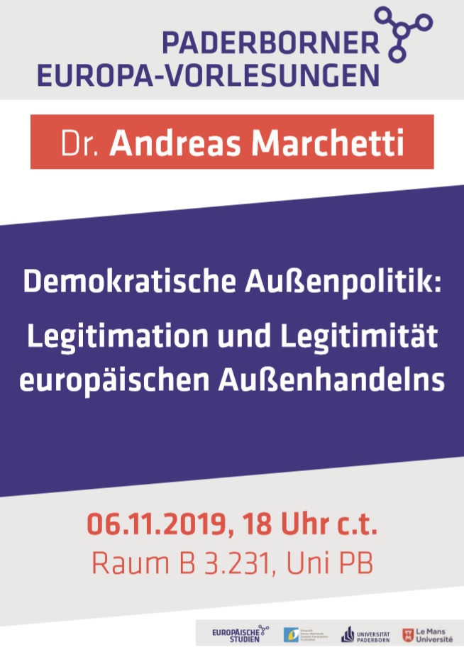 Am Mittwoch, 6. November, startet die zweite Runde der „Paderborner Europa-Vorlesungen“ der Universität Paderborn mit einem Vortrag von Dr. Andreas Marchetti vom Zentrum für Europäische Integrationsforschung (ZEI) der Universität Bonn. Der Wissenschaftler wird über die aktuell vieldiskutierte Frage nach Anspruch und Grenzen einer gemeinsamen europäischen Außenpolitik referieren. Der Vortrag startet um 18.15 Uhr im Raum B3.231 (Senatssitzungssaal) und ist zugleich Marchettis Antrittsvorlesung als Honorarprofessor an der Hochschule. Interessierte sind herzlich eingeladen.