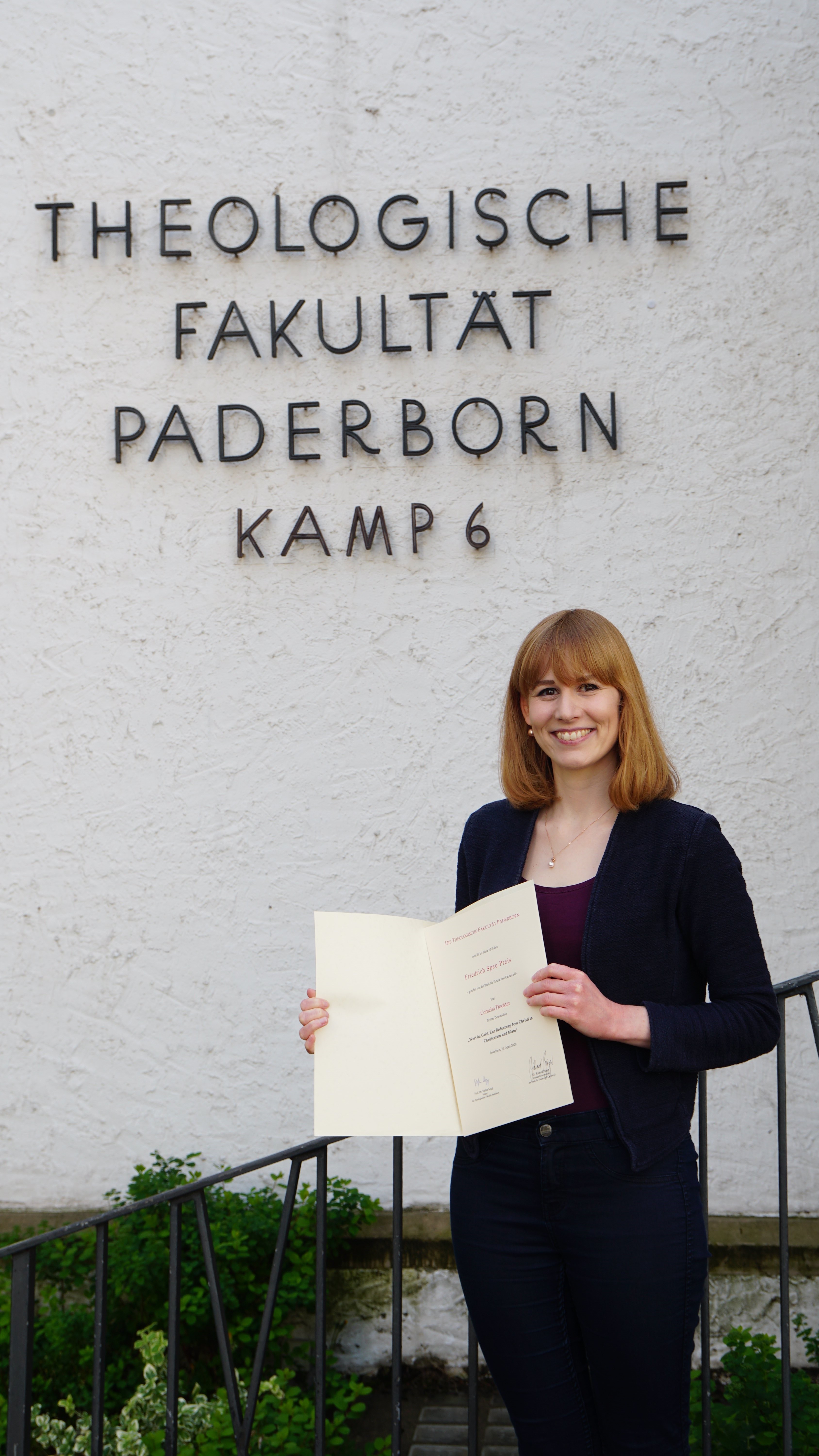 Die Theologische Fakultät Paderborn hat den Friedrich-Spee-Preis 2020 an Frau Dr. Cornelia Dockter für ihre Dissertation „Wort im Geist. Zur Bedeutung Jesu Christi in Christentum und Islam“ verliehen. Die Dissertation wurde von Prof. Dr. Josef Meyer zu Schlochtern, Lehrstuhlinhaber für Fundamentaltheologie an der Theologischen Fakultät, und Prof. Dr. Klaus von Stosch, Lehrstuhlinhaber für Systematische Theologie an der Universität Paderborn, betreut und mit der Bestnote summa cum laude bewertet.