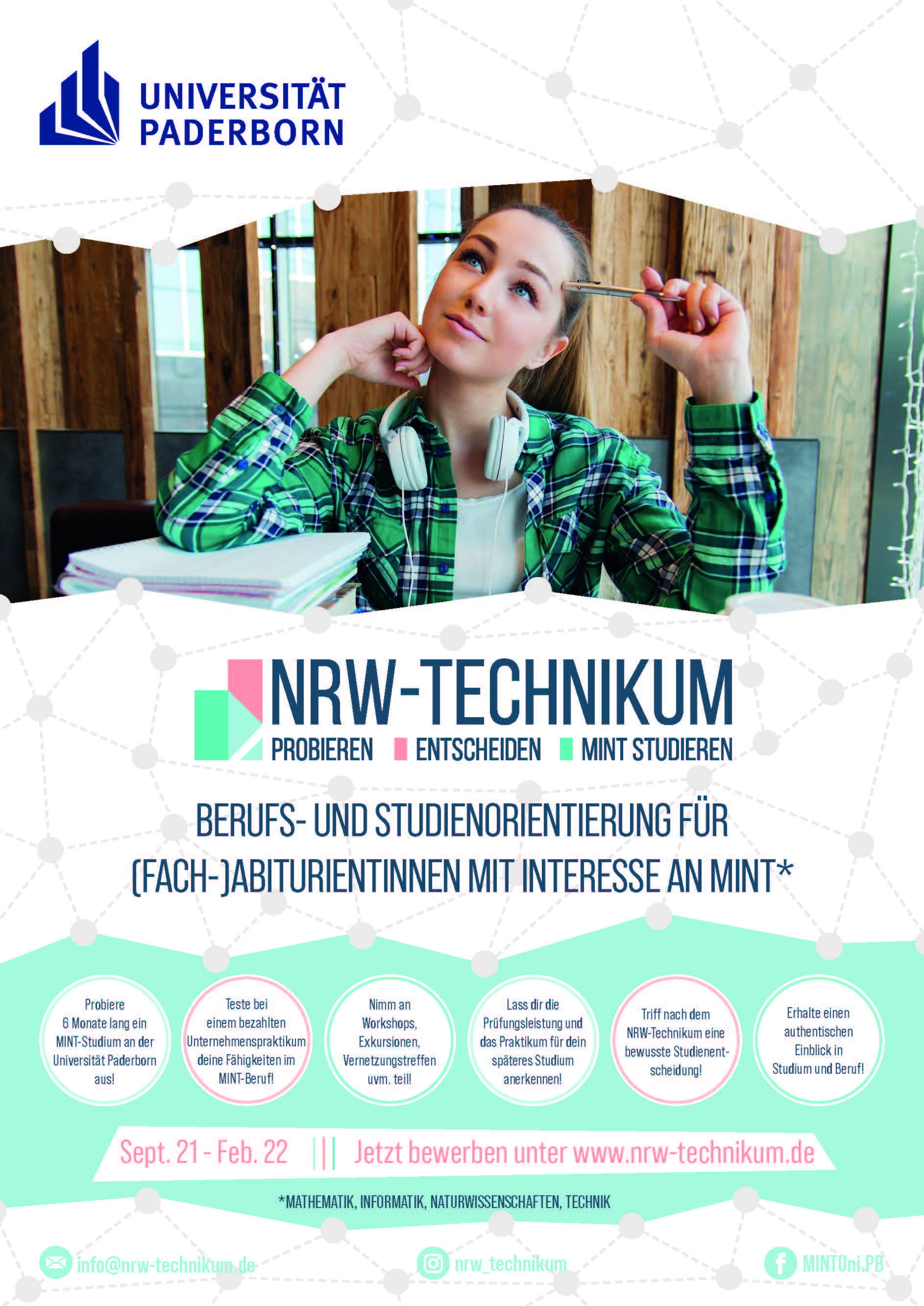 Im September startet mit dem „NRW-Technikum“ an der Universität Paderborn erstmalig eine neue Maßnahme zur Berufs- und Studienorientierung für (Fach-)Abiturientinnen mit Interesse an Mathematik, Informatik, Naturwissenschaften oder Technik (kurz: MINT). Das Programm richtet sich an junge Frauen, die bis zum Programmstart ihre Hochschulreife oder Fachhochschulreife erlangt haben und ausprobieren möchten, ob ein MINT-Studium und MINT-Beruf das Richtige für sie sind. Das duale Konzept kombiniert ein Schnupperstudium an der Universität Paderborn mit einem bezahlten Unternehmenspraktikum in der Region.