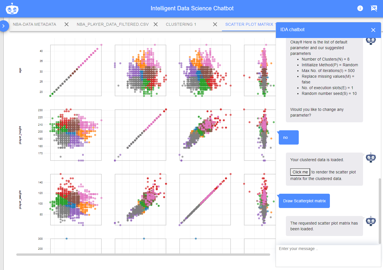 Prof. Dr. Axel-Cyrille Ngonga Ngomo, Leiter der Fachgruppe „Data Science“, erklärt: „Ein Benutzer kann auf der Plattform eigene Daten hochladen und analysieren. Dabei interagiert er über natürliche Sprache in Form von Textnachrichten mit dem Chatbot, um die Anwendung zu steuern. Die Befehle und Informationen in diesen Nachrichten werden an das Backend weitergeleitet. Als Analysewerkzeuge stehen verschiedene Visualisierungen, tabellarische Ansichten der Datensätze und Clusteringverfahren zur Verfügung. Bei einer Clusteranalyse werden die Daten aufgrund ihrer Ähnlichkeiten in zuvor ausgewählten Spalten in Cluster, also in Gruppen, eingeteilt. Zusätzlich unterstützt der Chatbot den Benutzer mit Empfehlungen.“