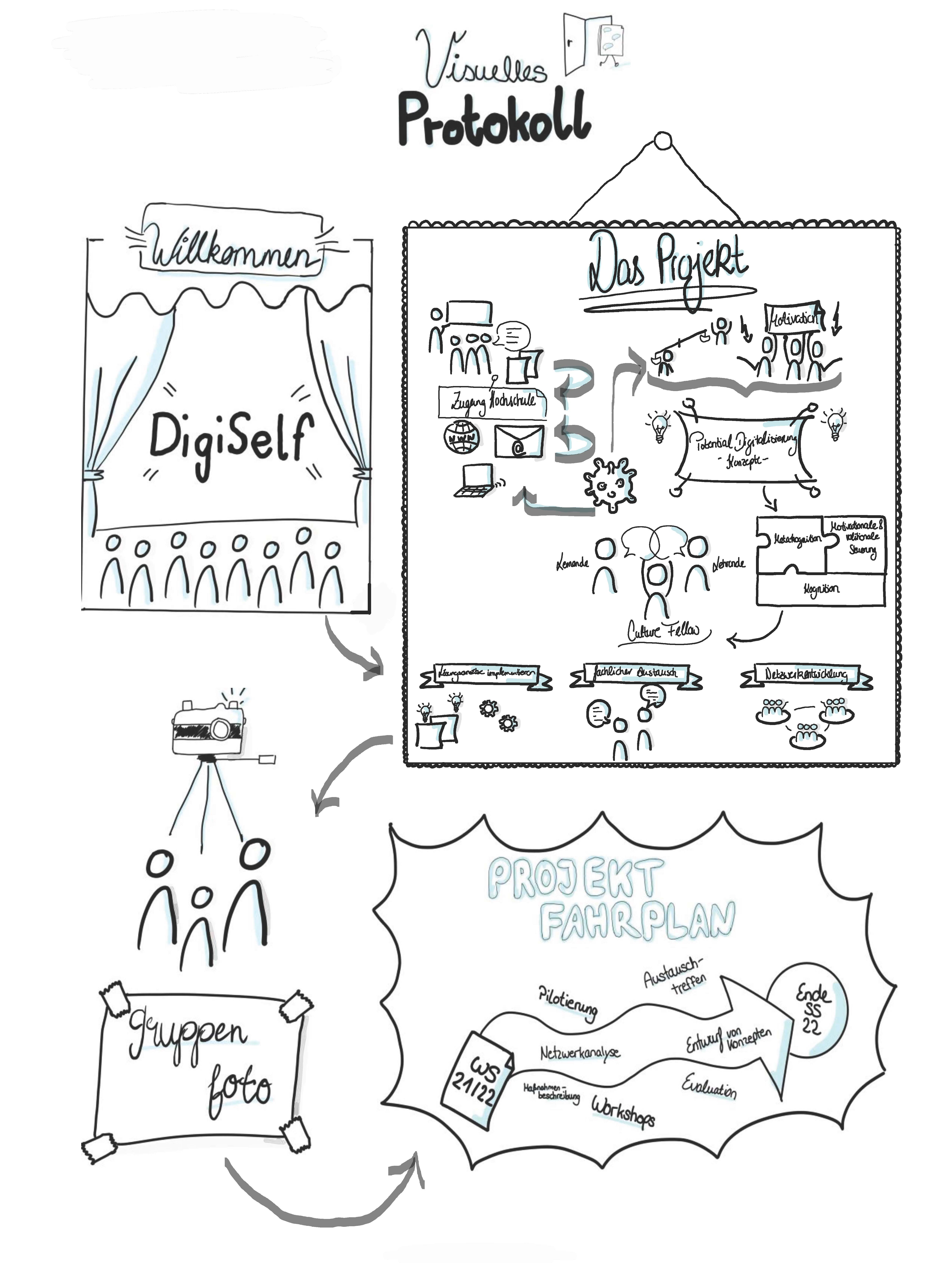 Ausgehend von der interdisziplinären Netzwerkveranstaltung im Oktober wurden Sketchnotes zum Projekt DigiSelF erstellt. Diese veranschaulichen auf abwechslungsreiche Art und Weise den Ablauf der Veranstaltung, aber vor allem auch die Struktur des Projekts und die Inhalte und Ideen der einzelnen Teilprojekte. Die so entstandenen Protokolle können wir für unsere interne Dokumentation und für die Außendarstellung (z.B. auf dieser Homepage) verwenden. Wir bedanken uns ganz herzlich bei Jennifer Tillmann und Christina Müller für die kreative Darstellung!